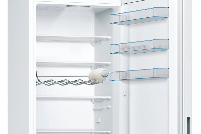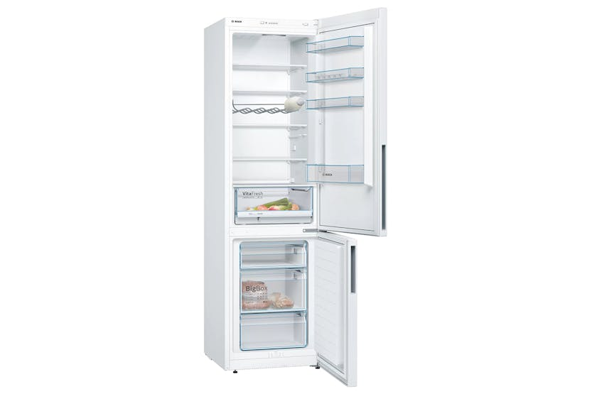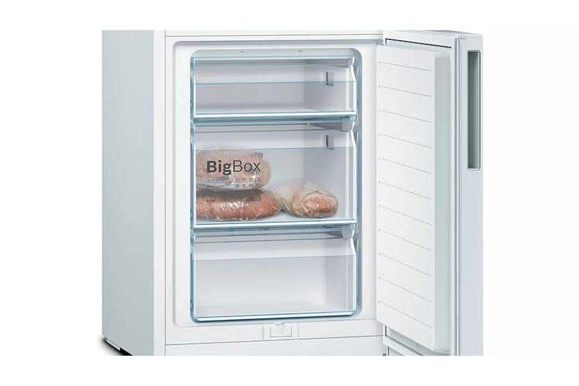 The Bosch Series 4 Freestanding Fridge Freezer | KGV39VWEAG offers a range of innovative features to keep your food fresh for longer and make accessing your items easier. With the VitaFresh drawer for climate-controlled storage, LED lighting for even illumination, and a BigBox frozen food drawer for XXL items, this fridge freezer provides ample space and convenience. The LowFrost and Superfreezing functions help reduce ice formation and protect pre-frozen food, while the FreshSense system ensures an ideal storage climate for optimal freshness and flavor. Experience the perfect combination of functionality and efficiency with the Bosch Series 4 Freestanding Fridge Freezer | KGV39VWEAG. With features like the VitaFresh drawer for longer-lasting fruits and vegetables, LED lighting for clear visibility, and the BigBox frozen food drawer for large items, this fridge freezer offers ample storage space and easy access to your food. The LowFrost and Superfreezing functions help save time and energy, while the FreshSense system ensures consistent temperature control for optimal food preservation.