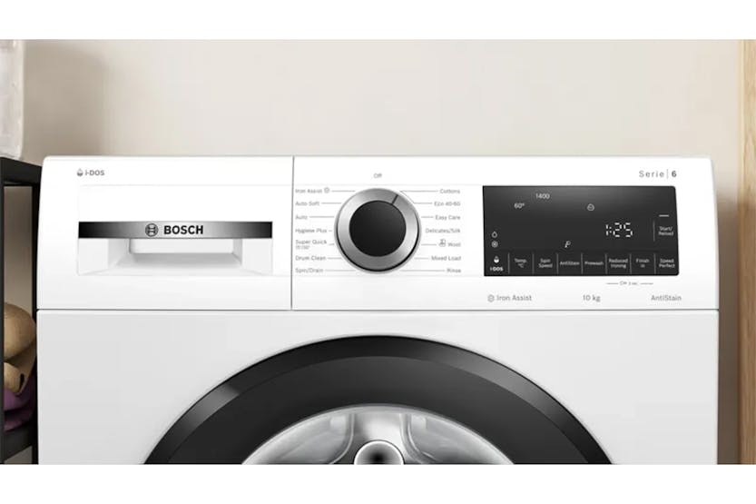The Bosch Series 6 10kg Freestanding Washing Machine | WGG254F1GB offers efficient and convenient laundry solutions for large families and busy households. With a 10kg capacity, AntiStain system, AntiWrinkle option, i-DOS automatic dosing system, and Eco Silence Drive technology, this washing machine provides spotless laundry, reduces wrinkles, saves water and detergent, tackles stubborn stains, and operates quietly and efficiently. Plus, with Speed Perfect, you can cut washing time by up to 65% without compromising on results, making it the perfect choice for those looking for a reliable and high-performance washing machine.