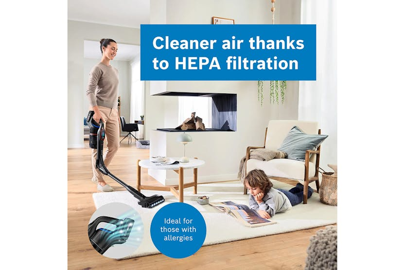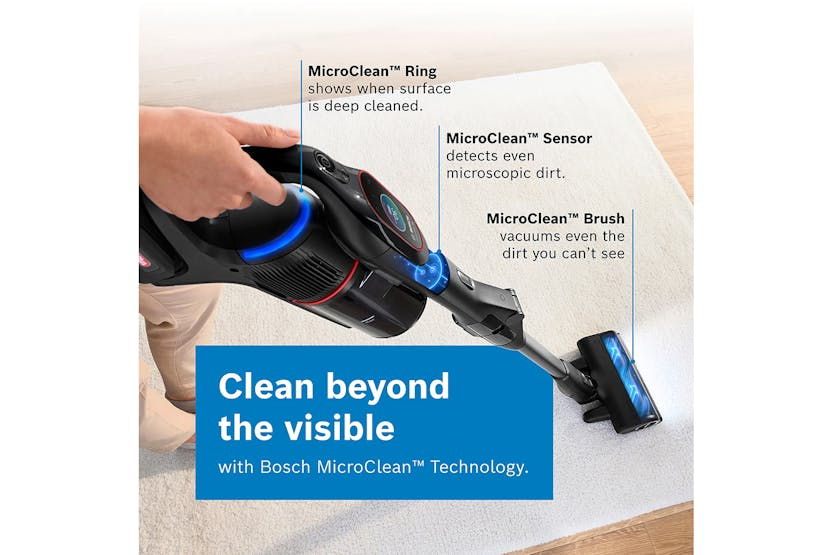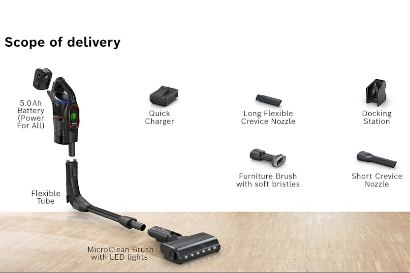 Description Check out the video: Our Best Cleaning Performance Paird with Extra Long Runtime of Up to 100min The Unlimited 10 ProPower pairs our longest runtime with Bosch's best dust pick-up. Enjoy thorough cleaning, even beyond the visible with the MicroClean Technology. The 5.0 Ah battery provides enough runtime to clean large areas of up to 300m[2]. With the powerful and enduring 5.0 Ah Power For All battery from Bosch, even demanding cleaning tasks can be mastered effortlessly. The lithium-ion battery is rechargeable, exchangeable and protected against overheating, overcharging, self-discharge and memory effect. Unique Microclean Technology: Clean Beyond the Visible The unique MicroClean technology redefines vacuuming. The MicroClean brush with LED lights has Bosch's best dust pick-up*FN_VACL_DPU_A01 and removes even invisible dust. The MicroClean sensor detects microscopic particles that are invisible to the human eye. Once the MicroClean ring is fully illuminated blue, you can rest assured that your floors are thoroughly clean. Over 99.9% Dust Pick-Up: [1] Of Even Invisible Dust with the Microclean Brush The MicroClean brush removes any type of dust and dirt from all floors. Whether it‘s coarse dirt or fine dust trapped in the depths of carpets, upholstery or in crevices of hard floors. Even invisible particles are vacuumed from all floor types such as carpet, parquet or tiles. The Unlimited 10 vacuums efficiently, both forwards and backwards. Up to 50% Less Emptying: Double Capacity and Easy Empyting No more dust clouds!The easy empty dust-box with the compression slider truly transforms your maintenance experience. Thanks to the dust compression slider the dust box needs to be emptied up to 50% less often [2] The emptying is significantly more hygienic as the compressed dust and dirt can be simply pushed out of the dust-box. Experience Cleaner Air: Up to 99.99% Filtered [3] Exhaust Air, Incl. Allergens. Thanks to the HEPA Filtration System [4] up to 99.99% of dust particles are filtered [3] and prevented from being released back into the room. The combination of various filters, sealings and a cyclone in the dust-box ensures that the exhaust air is cleaner than the ambient air in your home – perfect for allergy sufferers. The metal mesh filter is durable and hygienic. RotationClean allows for more hygienic cleaning of the filter inside the dust-box for reduced dust exposure. Anti-Hair Tangle: 3x Less Hair Tangling [5] The MicroClean brush is equipped with an extra-large diameter bristle roller for 3x less hair tangling [5]. The large diameter of the roller and the special arrangement of the bristles prevents hair from entangling around the roller. The bristle roller can be easily detached for deep cleaning of the brush. Interactive Display: Switch Modes, Watch Tutorials and More on You Vacuum's Screen The smart interactive display gives you full control of your Unlimited 10. It shows the remaining runtime and lets you easily switch between 6 cleaning modes. Watch tutorials straight on your device or access the smart usage guide for more information. Extend your battery lifetime with the battery brotect option and enjoy prolonged runtime by activating the Energy Saving Mode. It's not just a device, it's your smart cleaning companion! Up to 40% More Efficiency with 10-Year Guarantee The impressive cleaning results are based on the high performance of the next generation brushless TurboSpin Motor with Smart Motor Control, developed and made by Bosch in Germany. The 3-phase synchronised digital motor reaches up to 70.000 rpm. The interplay of motor, brush and battery enables outstanding cleaning performance with up to 40% higher efficiency [6] –. Bosch prioritizes the longevity for their vacuum cleaners. That‘s why this Unlimited comes with a 10-year motor guarantee [7]. One Exchangeable Battery for 100+ 18V Tools The only battery you need for your devices. The exchangeable batteries are part of one of the largest cross-brand 18V battery systems and provide the greatest application variety for home users in the market. They are compatible with 100 + different 18V power tools and devices from Bosch (including the green line) and 10+ leading manufactures worldwide – across many tools like power tools, garden tools, outdoor and indoor cleaning. Save money, space and contribute positively to the environment. Ergonomic Features for Convenience and Flexibility Enjoy more versatility! The convenient Flex Tube makes it possible to reach places under low furniture effortlessly, and the Quick Stand allows flexible cleaning with the handheld while the nozzle and tube stand by themselves. With the Nozzle Foot Release you can detach the nozzle from the tube without bending over to easily switch to spot cleaning with the practical tube. This makes the Unlimited 10 perfect for cleaning all types of surfaces, as well as hard-to-reach areas. What's in the Box: 1 x Crevice nozzle 1 x Furniture brush 1 x Charging cable 1 x Quick charger 1 x Exchangeable battery pack 1 x Docking station 1 x Long flexible crevice nozzle Product Features: The Unlimited 10 ProPower pairs our longest runtime with Bosch's best dust pick-up MicroClean technology: Clean beyond the visible with MicroClean technology and rest assured that thanks to the MicroClean sensor your vacuum picks up even microscopic dirt that would usually be missed MicroClean brush: Experience Bosch’s best dust pick up with over 99.9%* that removes even microscopic particles with the MicroClean brush Up to 50%** less frequent emptying of the dust-box thanks to the dust compression slider and dust-box capacity [2]. The easy to empty dust-box makes it more hygienic and effortless to empty HEPA Filtration system[4]: Experience cleaner air with the built-in HEPA filtration system, removing up to 99.99%* of dust particles, including allergens Breathe easier knowing the air leaving the vacuum is cleaner than the air take in [3] Charging time: 1 h