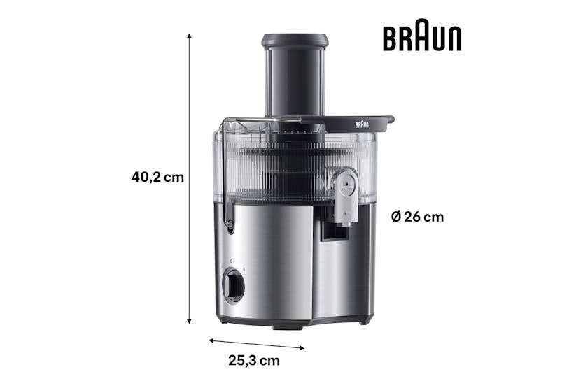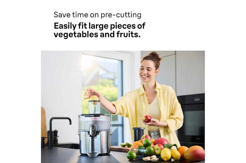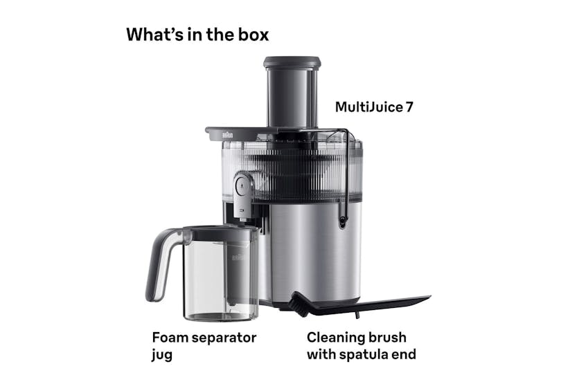 Description The MultiJuice 7 delivers fresh, nutrient-packed juice in seconds. With 1000 watts of power, it extracts up to 2.5 litres of juice from chunky fruit and veg – even whole apples – in one go. ColdXtract Technology keeps your juice cool to lock in nutrients, while the large chute, anti-drip spout and easy-clean design make everyday juicing quick, clean and fuss-free. ColdXtract Technology Keep the vitamins, skip the heat. Our smart cooling system keeps temperature-rise under 1.5°C, so your juice stays nutrient-packed. FastXtract Technology From fruit to glass in under 15 seconds. Because great mornings shouldn't require a time commitment. 2L Pulp Container Extract up to 2.5L of juice without stopping. Less emptying means more time for juicing. 75mm Round Chute Whole apples, welcome. The generous opening handles large fruit and vegetables with ease - no knives needed. Anti-Drip System One push of the Anti-Drip button stops juice from dripping once you remove your glass, keeping counters mess-free. 2-Speed Settings Soft peaches, hard carrots – we've got settings for both. Choose your speed and let the juicer do the rest. Foam Separator Jug Pure juice, no foam. The 800ml jug keeps the froth where it belongs (in the jug, not your glass). Easy Cleaning Dishwasher-safe parts and a purpose-built brush make cleanup surprisingly satisfying. Even the pulp container has smooth, non-stick edges to spare you scrubbing.