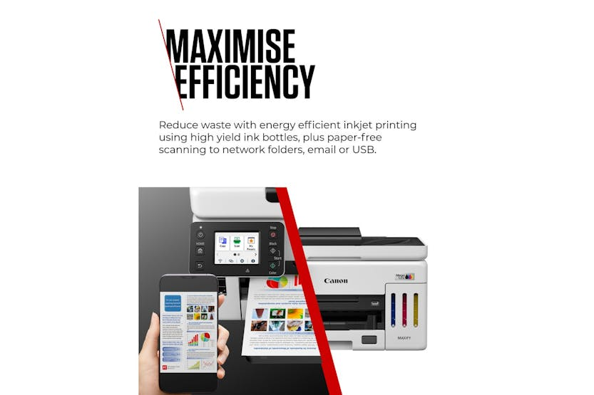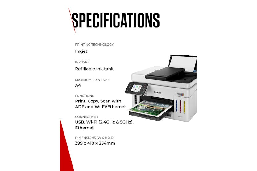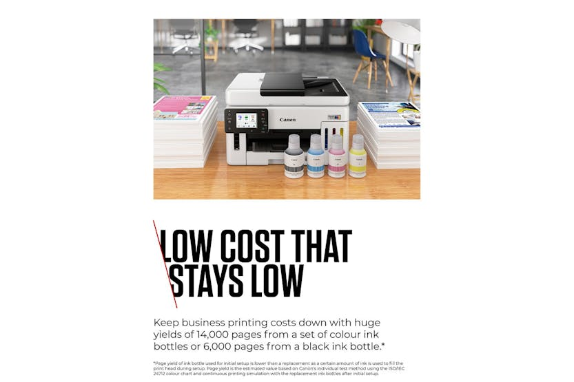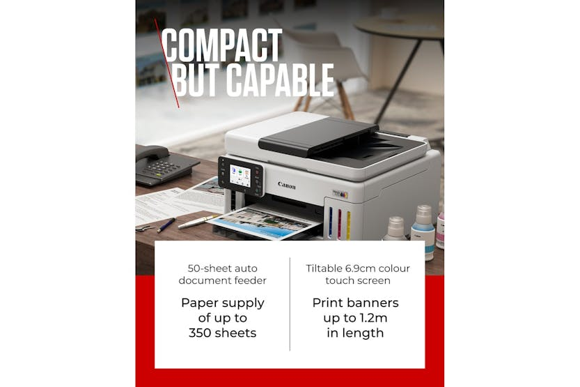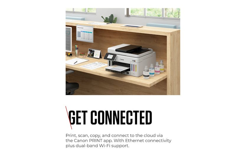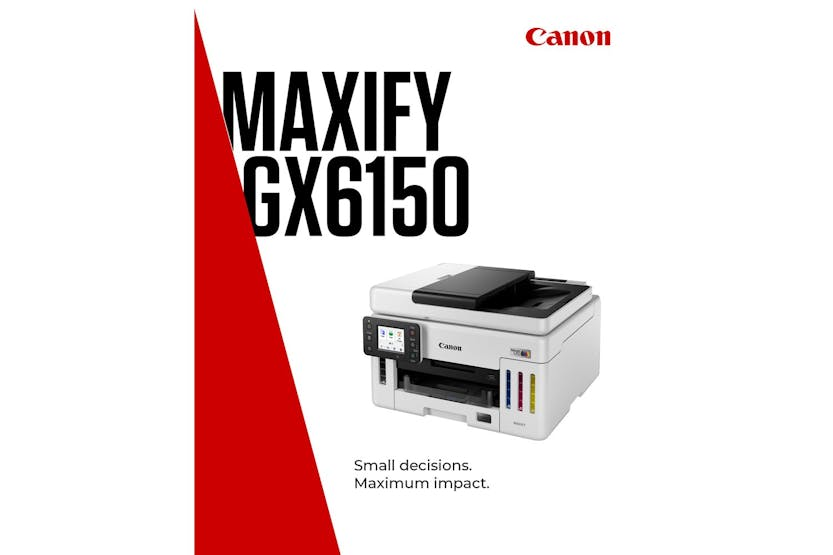 Description Online Only Introducing the CanonMAXIFY GX6150 Multifunction MegaTank Printer , a revolutionary product in the world of printing and cutting. Brought to you by the trusted brand CANON , this high-performance printer has been designed to deliver unmatched convenience and top-notch performance. Belonging to the elite category of Computers & Tablets , especially in the line of PRINTING & CUTTING , CANON has indeed set the mark high with this multifunction MegaTank printer. This awesome beast doesn't just fit into your PRINTERS & MULTIFUNCTIONS needs; it surpasses them with breathtaking functionality. Being driven by innovative technology, the CanonMAXIFY GX6150 will revolutionise your printing experience. Its ultra-fast, crisp, and high-quality prints will not just fulfil, but exceed your expectations. Contrastingly, the compact design of the printer allows for easy setup and usage, making it an ideal choice for both professional and personal use. With its revolutionary MegaTank technology, you can harness the power of high volume printing like never before. The compact design and silent operation make it the ideal solution for a convenient yet quiet work environment. Plus, with high-speed scanning, multiple connectivity options and user-friendly touchscreen operation, printing tasks have never been this simple. The remarkable CanonMAXIFY GX6150 Multifunction MegaTank printer offers unique features that set it head and shoulders above the rest: The CanonMAXIFY GX6150 holds the crown in the realm of top-class printers. Ideal for anyone seeking a reliable and efficient printing experience, it's absolutely one of the must-haves for every office and home. Join the many happy Irish consumers already experiencing the superior performance and convenience this printer has to offer and elevate your printing tasks to a whole new level. Order your CanonMAXIFY GX6150 today! Product Features An in-built MegaTank system for cost-effective, high-volume printing. High-speed scanning and printing capabilities. A sleek, modern design that fits seamlessly into any work or home office environment. Packed with advanced technology and user-friendly features. Easy to set up with a guided installation process. Compatible with various media sizes, adding to its flexibility.