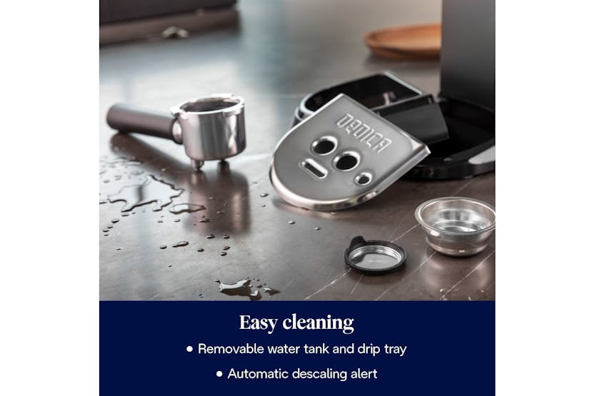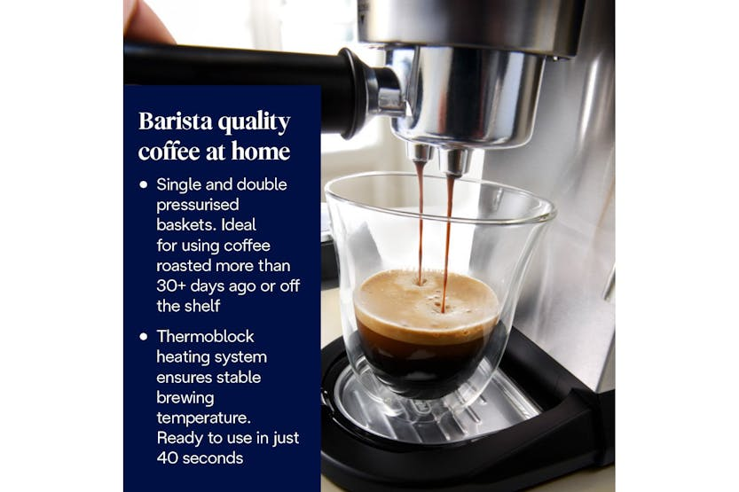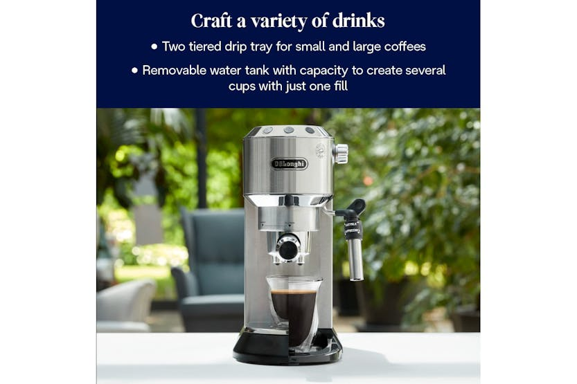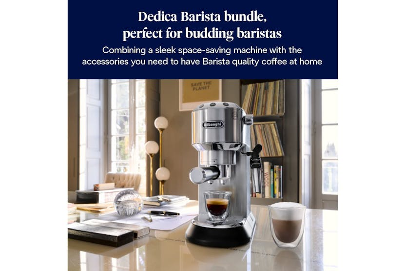 The De'Longhi Dedica Barista Bundle in stainless steel is the perfect choice for aspiring baristas looking to create coffee shop quality drinks at home. With single and double pressurized baskets for the perfect crema, an assisted steam wand for creating frothy cappuccinos and silky lattes, and a quick 40-second heat-up time, this bundle has everything you need to master latte art and enjoy a delicious cup of coffee in minutes. The sleek, compact design makes it ideal for smaller kitchens, and the included accessories like a tamper, milk jug, blade coffee grinder, and knock box ensure you have everything you need to start your coffee journey right away.