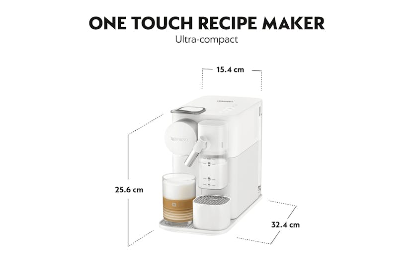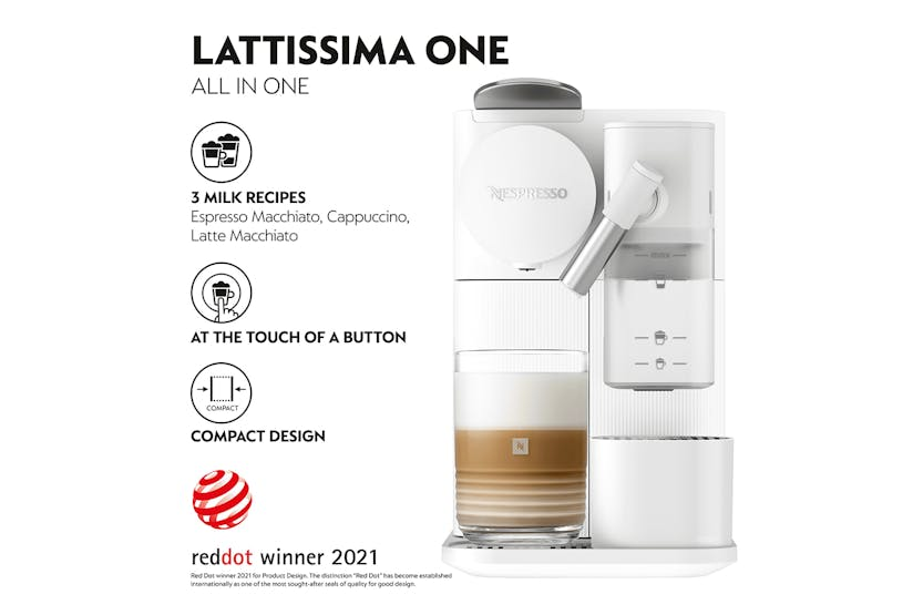 Description Add a touch of style to your kitchen with the Lattissima One single-serve design. The patented milk system delivers your favourite coffee & milk drinks at the touch of a button. Thanks to an optical sensor, the machine recognises the quantity of milk in the jug, and uses it all, avoiding any waste One touch fresh milk system with a compact, dishwasher safe milk jug The exclusive single serve system features an optical sensor, using all the milk in the jug to prevent waste 3 beverage buttons to easily select your favourite drink: espresso, lungo and a milk recipe for cappuccino or latte macchiato Single Serve Cappuccino System Prepare perfectly creamy and long-lasting milk beverages at the touch of a button without wasting milk. Ease of Use Elegant and intuitive touch interface allows you to instantly select your favourite drinks. 19 Bar Pressure Pump The 19 bar pump ensures perfect in-cup results, delivering the correct amount of pressure and water flow according to the type of beverage selected. Lattissima One design Lattissima One features a premium and compact design with quality finishing and materials, including the chrome lever, subtle gloss finish and matt line patterns. Product Features: Milk System: Automatic Cappuccino System Auto clean system Flow stop Descaling alert Eco-mode: Power off after 2 min Heat-up time: 25 sec