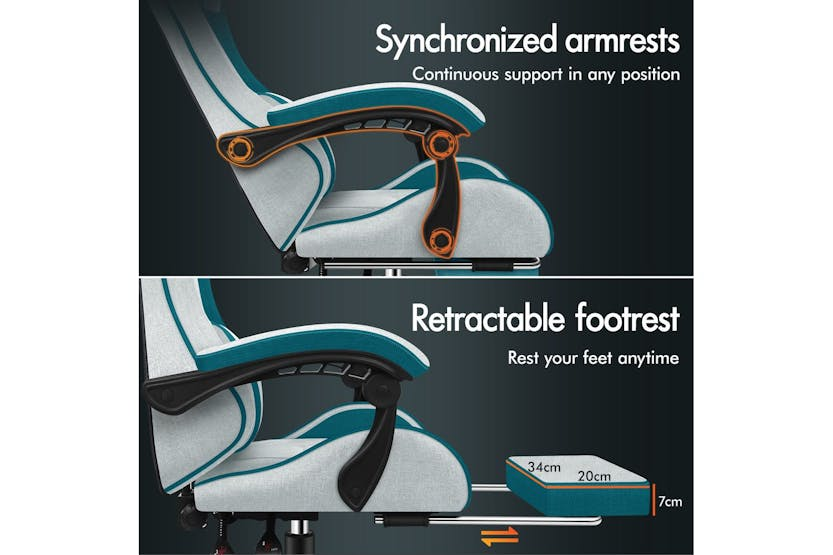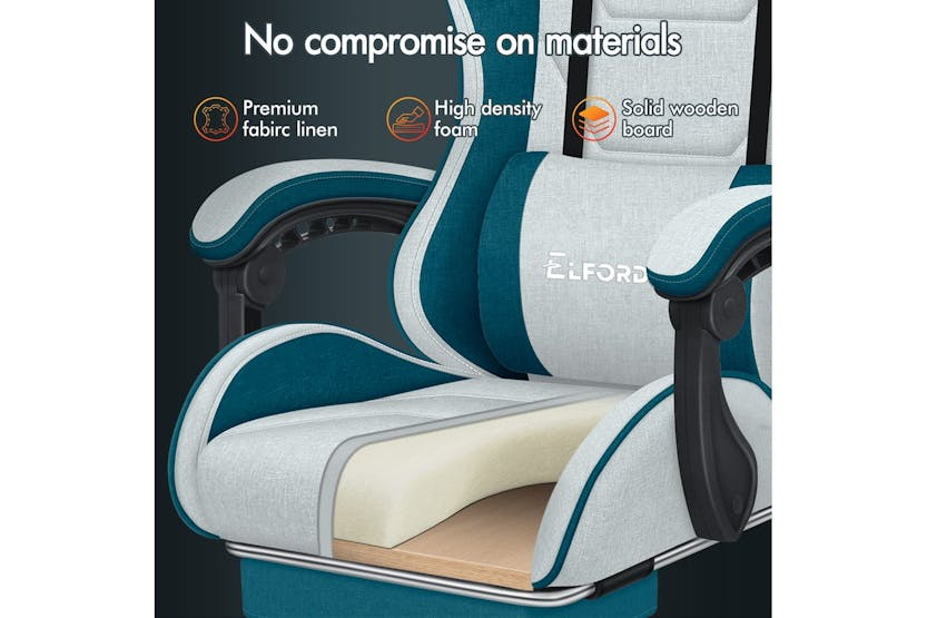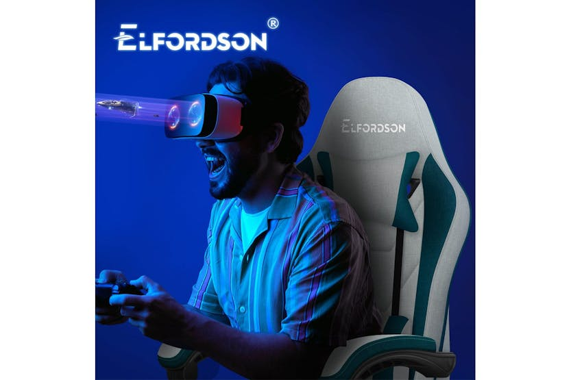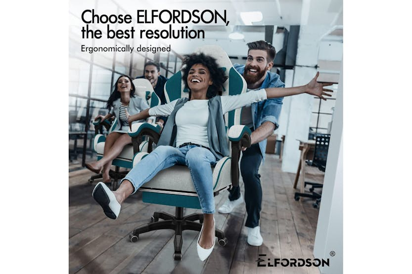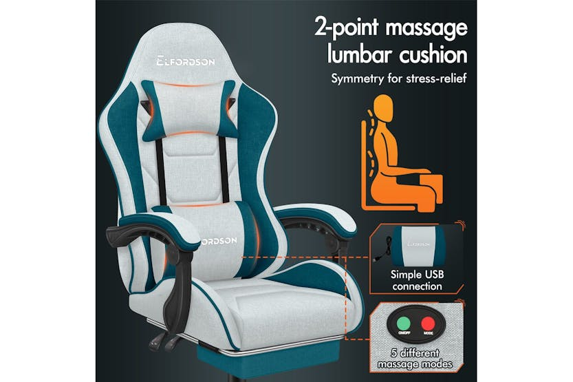 Description Online Only - Free Delivery Multiple Uses Choose Elfordson, the Best Resolution Ergonomically Designed Thor Series 2-point Lumbar Massage 150° Backrest Recliner Dynamic Ergonomics Reinforced Steel Base SGS-safe Gas Lift Nylon Base with Quality Wheels Integrated 2- Point Massage Enjoy soothing. This high back gaming chair provides USB-powered vibration massage in adjustable & removable lumbar cushion, it helps alleviate back tension, enhancing comfort during gaming, work, or study sessions. Posture-Perfect & Cool Comfort This ergonomic computer PC chair features an engineered frame aligned with your spine's natural curve, personalising your comfort with adjustable headrest and lumbar support. The generous seat is padded with high resilience foam, providing excellent body support while reducing pressure points on hips and thighs during extended use. Breathable fabric linen ensures optimal airflow. Flexible As you Need With 10cm of height adjustment, this gaming chair comfortably accommodates children, teenagers, and adults. The linkage armrests move along with the reclining backrest (90°-150°), ensuring continuous arm support whether gaming, working, or resting. Retractable footrest enhances relaxation, while 360° swivel and multi-directional silent casters enable smooth movement. This PC chair allows you to move effortlessly at home, office, or e-sports playroom. Vibrant & Premium 6 colour options available for various decoration styles. Crafted with TUV-certified casters, solid streamlined nylon base, and an SGS-approved gas lift mechanism with over 120,000 tests. This computer desk chair accommodates users up to 180kg (400 lb), deliverig ultra stability and safety. Product Features Frame material: Engineered wood Back style: Cushion back Adjustable lumbar Adjustable height Arm rest Ergonomic Head support Read More