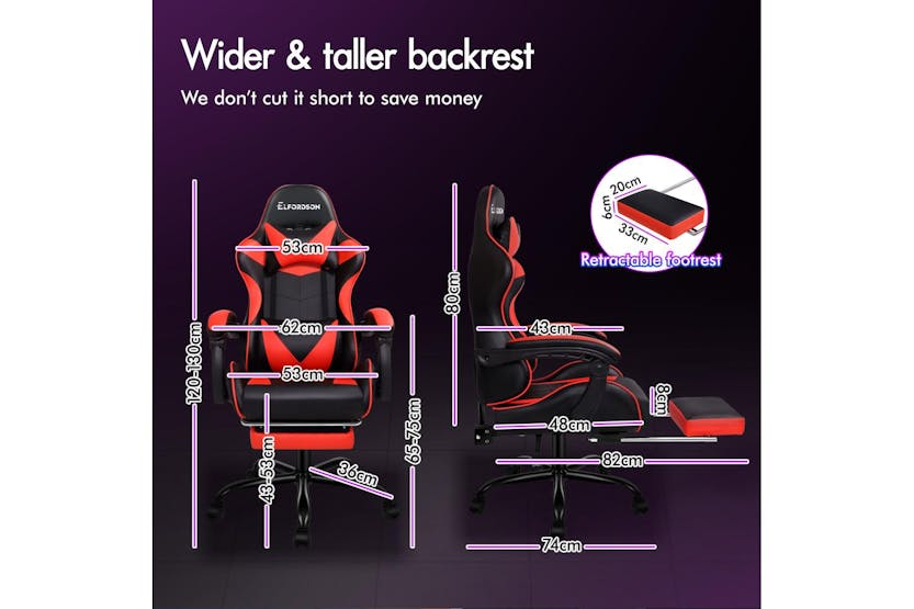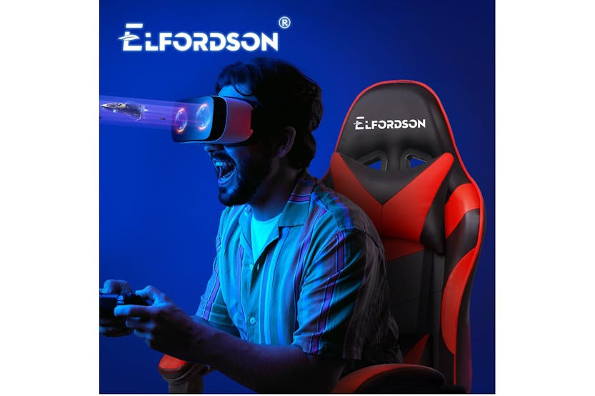 Upgrade your gaming experience with the Elfordson 2-Point Massage Gaming Chair in striking red. Designed for professionals and gamers alike, this chair features innovative lumbar massage technology for precise muscle relaxation. The high-density foam padding and adjustable cushions ensure all-day comfort, while the durable construction guarantees long-lasting use. With dynamic ergonomics and premium materials, this chair is a must-have for anyone who spends extended periods at their desk. Experience ultimate luxury and comfort with the Elfordson 2-Point Massage Gaming Chair. With a 150° recliner, adjustable cushions, and whole-piece foam construction, this chair offers enhanced support for your back and neck. The lumbar massage feature, premium materials, and ergonomic design make this chair perfect for long gaming sessions or workdays. Upgrade your setup with this stylish and functional gaming chair today.
