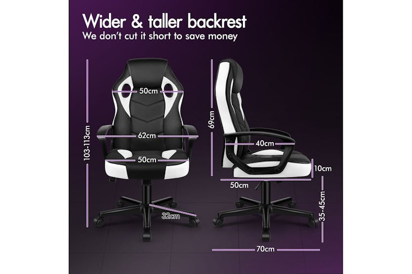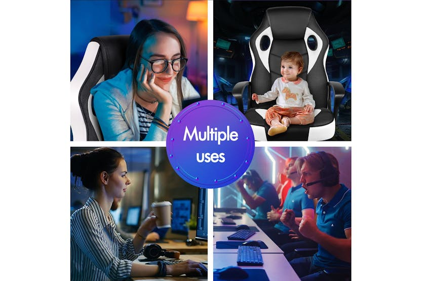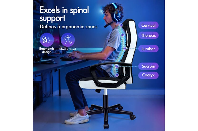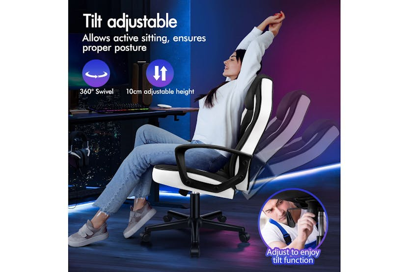 Experience ultimate comfort and support with the ELFORDSON Gaming Chair in white. Crafted with a blend of PU leather and breathable mesh, this chair offers ergonomic design to reduce strain and enhance posture during long gaming sessions or work projects. With a 360-degree swivel, tilt adjustment, and high-grade casters, enjoy smooth movement and convenience while meeting safety standards with TÜV, Intertek, and BIFMA approvals. Elevate your gaming or work experience with the ELFORDSON Gaming Chair, designed for Irish professionals seeking functionality and style.