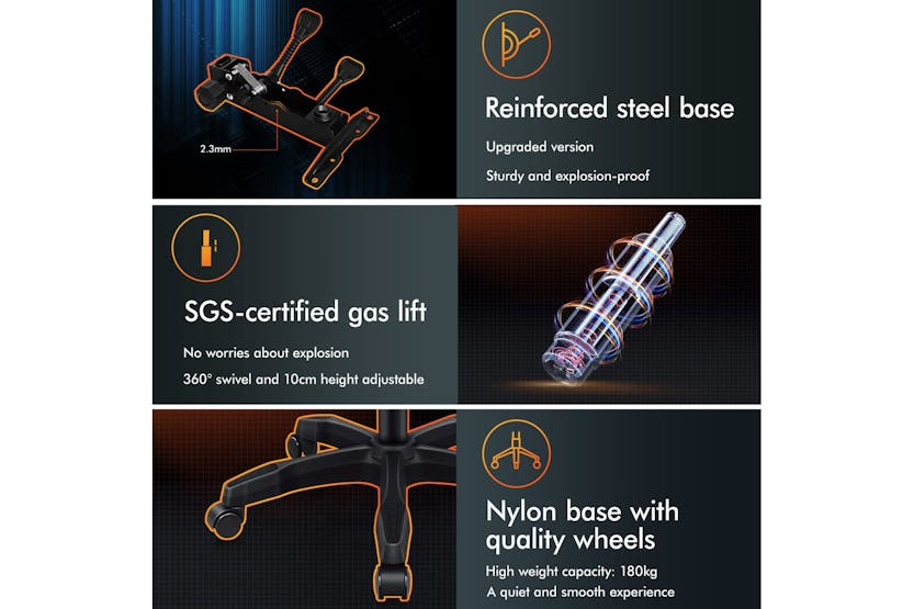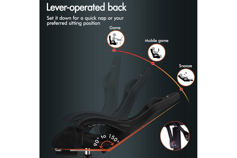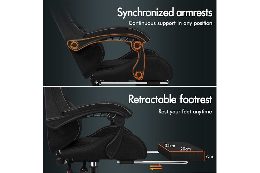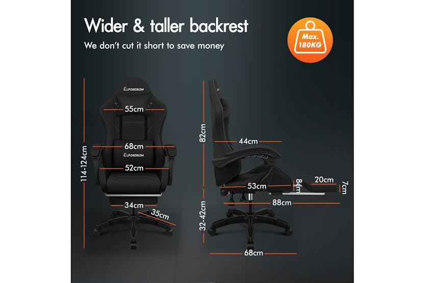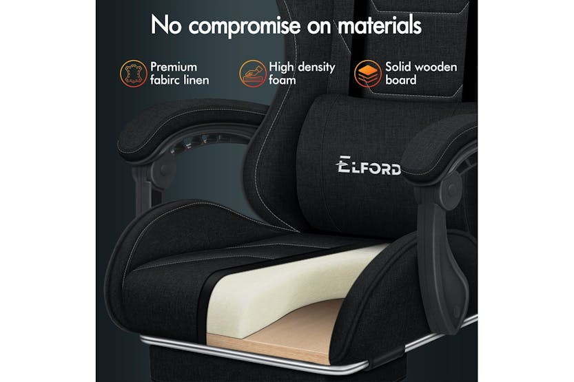Experience the ultimate comfort and style with the Elfordson Gaming Chair in black. Designed for both gamers and executives, this chair features top-notch breathable Fabric Linen, car-seat grade foam padding, and a 2-point massage function with adjustable cushions for optimal support. With a 150-degree tilt and 360-degree swivel, this chair offers a perfect blend of flair and function for your gaming or working needs. Safety is ensured with SGS-approved gas-lift and TUV-approved caster wheels, making it a reliable and stylish addition to your space. Enhance your sitting experience with the Elfordson Gaming Chair, offering a luxurious combination of comfort and functionality. With its sleek black design, sturdy sporty nylon base, and ergonomic features like adjustable cushions and a 2-point massage function, this chair provides the perfect support for long hours of gaming or work. The 360-degree swivel and 150-degree tilt allow for easy movement and posture adjustment, while the SGS-approved gas-lift and TUV-approved caster wheels ensure safety and stability. Upgrade your seating experience with the Elfordson Gaming Chair and enjoy a new level of comfort and style in your space.