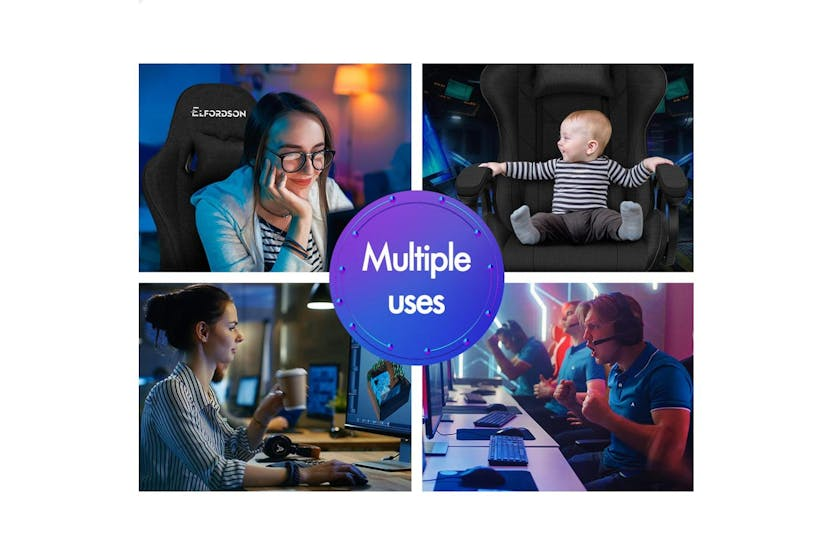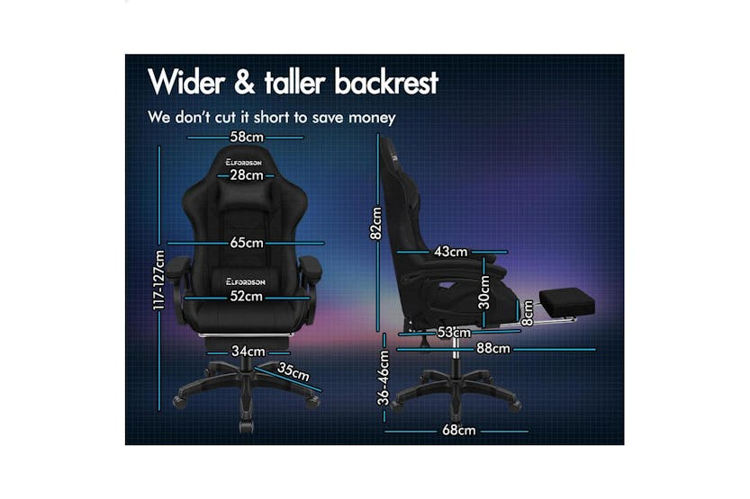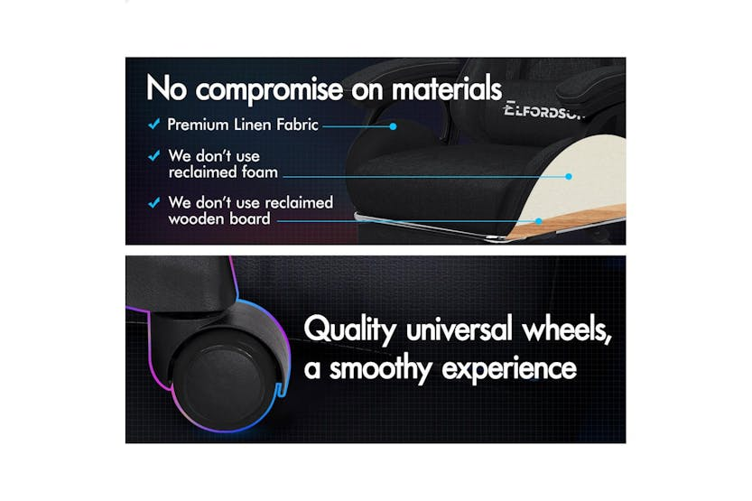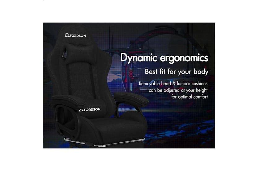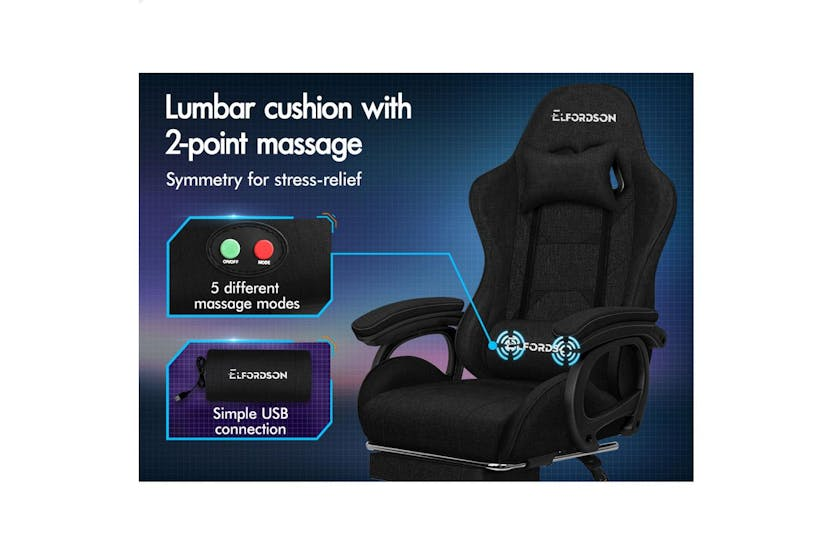 Description Online Only - Free Delivery Product Description ELFORDSON Gaming Chair in Linen Fabric - Xavier Collection Specially designed for serious gamer and smart working executive who loves the adrenaline of residing in a gaming chair, the Elfordson gaming chair in Xavier collection is the ultimate for movers and shakers like yourself. Crafted with deluxe linen fabric, generous foam paddings and ergonomically-friendly design with detachable and height-adjustable lumbar and neck cushions, Elfordson racer chair provides your entire body with ample support in all the right places. The 2-point lumbar massage function allows you to work or play at your peak for long periods of time in optimal comfort. With an X pattern in the middle, the Xavier chair perfectly combines both comfort and style. The chair features 150 degree back recline adjustment and 360 degree swivel. You can lock the position of reclination as you wish. Combined with retractable padded footrest, it suits your personalized positions while sitting, sleeping or playing games. An elite in quality and design, your solution to true comfort. A stylish nylon base with TUV certified casters, Intertek approved linen fabric, SGS approved Gas-Lift system and tilt function, delivering absolute five star luxury. And unlike some other sellers, we have no compromise on materials used. We guarantee that no cycled foams are used, no backrest is cut short or narrow to save money, and no seat foam is cut thin to save cost. The Elfordson range is available in multiple colours and designs, browse Elfordson store and choose one that best suits you or your room. Take the stress out of work and experience superior comfort at your desk - order your Elfordson gaming office chair today! Specifications Intertek approved supreme linen fabric SGS approved gas-lift, no worries about explosion TUV approved caster wheels Triple-layer seat: linen fabric + resilience foam + robust wooden board High weight capacity: 180kg Colour: Black What's in the Box: 1 x Elfordson office chair 1 x Assembly manual Product Features: Dynamic ergonomics design, best fit for your body Wider & taller backrest, we don't cut it short to save cost Enhanced lumbar pillow with massage function! 2-point massage & 5 massage modes Upgraded slide rail armrests Deluxe PP plastic armrests with padding, wide and supportive Removable and height-adjustable head & lumbar cushions Generous foam paddings, we don't cut it thin to save money High resilience foam in car-seat grade Whole-piece moulding foam, better weight distribution and support No compromise on materials, we don't use recycled foam Eliminates back and shoulder pressure Up to 150 degree back recline adjustment Able to lock the reclination position Retractable padded footrest Deluxe tilt adjustment Smoothly 360 degree swivel Premium universal wheels, a smooth experience Sporty nylon base with a touch of matching colour Ideal for gamer and business uses