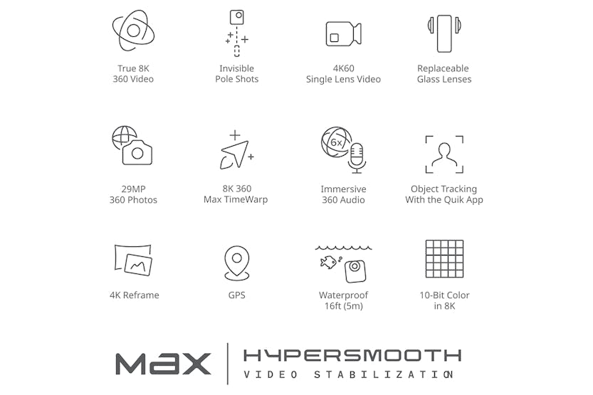 Capture every moment in stunning True 8K 360 video with the GoPro MAX2 Camera in Black. With up to 21% more resolution than competitors, this camera offers unmatched image quality and durability. Easily create immersive POV footage, selfies, and more, and edit your videos with the powerful GoPro Quik app for shareable 4K content. Get creative with replaceable lenses, invisible mounting options, and advanced features like HyperSmooth stabilization and TimeWarp capabilities. Elevate your content with the MAX2 Camera - it's more than just a 360 camera, it's 360...MAX'D.