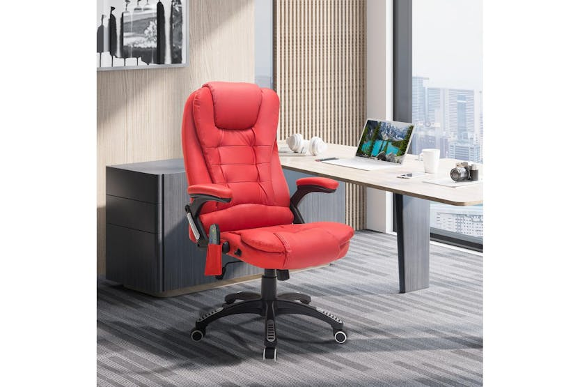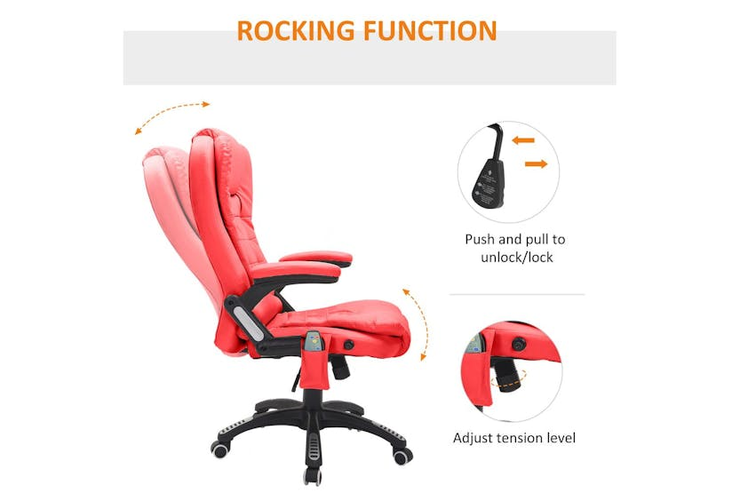 Description Online Only - Free Delivery Experience unrivalled comfort and functionality in your workspace with the HOMCOM 921-284V70RD Ergonomic Chair with Massage. Elevate your at-home office experience with this luxurious chair, engineered with unique features that have melded comfort with professionalism seamlessly. Designed with style and functionality in mind, the HOMCOM office chair enhanced with heat and massage functions offers an admirable blend of modern aesthetics and state-of-the-art amenities. As a sophisticated office user in Ireland, indulge in the coveted freedom of personalising your experience, as the heat and massage operations work independently of each other. Striking the balance of style, comfort, and dining office productivity, the HOMCOM ergonomic chair boasts a classic executive design with premium faux leather that amps up your workspace's integrity while offering years of unwavering boss-life bliss. You will appreciate the thick padding on those long working hours, designed for supreme comfort assuring that no day is too long at the office. Raising the bar high on support, the tall back and the sturdy armrests ensure you have the right posture, significantly reducing backaches and neck strains. The five wheels on the base add to the convenience, ensuring mobility when the multitasking days kick in. Joyously lean into the work-from-home culture with the HOMCOM ergonomic office chair designed to optimise comfort for Irish consumers. Celebrate your professional endeavours embraced in comfort that rivals the traditional office setup, bringing the whole office experience right to your doorstep. To the savvy Irish who appreciates value, invest in the HOMCOM office chair that delivers everything an ideal office chair must, fusing efficiency, comfort and style without fail. Elevate your workspace whim with the chair that screams you deserve it! Key Features: Heat and massage functions that operate independently Luxurious faux leather design Thick padding for maximum comfort Tall back and armrests for optimal support Five wheel-base for effortless mobility