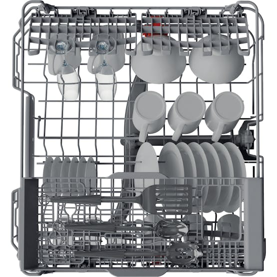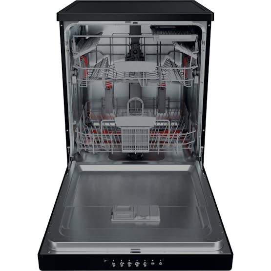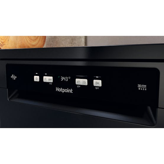 Description Inverter Motor With the capacity to vary the spinning speed, the innovative Inverter Motor can properly calibrate water pressure and, therefore, cleaning force, combined with an optimised electronic control at all times. The magnets allow precise control of sprayers, directing the water with the right pressure, in the right spot, and at the right time. Flexiload Capacity for up to 13 place settings is created by a flexible storage system, including a Vertical Zone that lets you secure pans vertically to free up space in the lower basket. 3D Zone Wash The combined action of the powerful water jets from the upper and lower spray arms and the variable speed inverter motor makes sure precisely the right amount of water is used throughout the selected basket for either 40% more cleaning power or 40% more energy efficiency, depending on your needs. The average percentage of performance increase vs a non-3D Zone Wash appliance running an Intensive cycle, obtained on 17 different items with different typologies of dirt. Test results verified by VDE. Verified in the Report N° 236127-AS6-1 by VDE Test Institute. Product Features: Removable worktop Digital countdown indicator Salt light indicator Rinse aid light indicator Safety device HOTPOINT HFC 3C26 WC B UK Dishwasher Play Button Play Button dimensions (cm) 85 height 60 width 59 depth Energy rating Installation type Free-standing Product Information Sort the clean-up in one swoop with the Hotpoint Extra HFC 3C26 WC B UK Dishwasher in black. With capacity for 14 place settings, choose between Rapid, Half Load and Eco wash cycles to restore the sparkle to your plates, cups and cutlery. Dual Space gives you the versatility to alter the height of your top basket in one quick, easy movement. Making more space in the basket below for larger pots and pans, you can change the layout, even if you’re already fully loaded. Plus, with a third sliding tray for long cutlery, there’s space for all your cooking utensils too. Complemented by programs to suit every event, choose between Rapid, Half Load and Eco, with an 11L cycle for the environmentally minded, and Extra Dry to achieve the very best results, even on plastics. The stainless steel tub helps to ensure an extra level of hygiene, whilst the 24hr Delay Timer lets you load then pick a time to run the cycle at your convenience. 16 Place Settings This dishwasher offers space for all your needs. Three baskets enable washing up to 16 place settings at a time. Product Fiche Daily Reference Guide New Energy label NEL Data Sheet