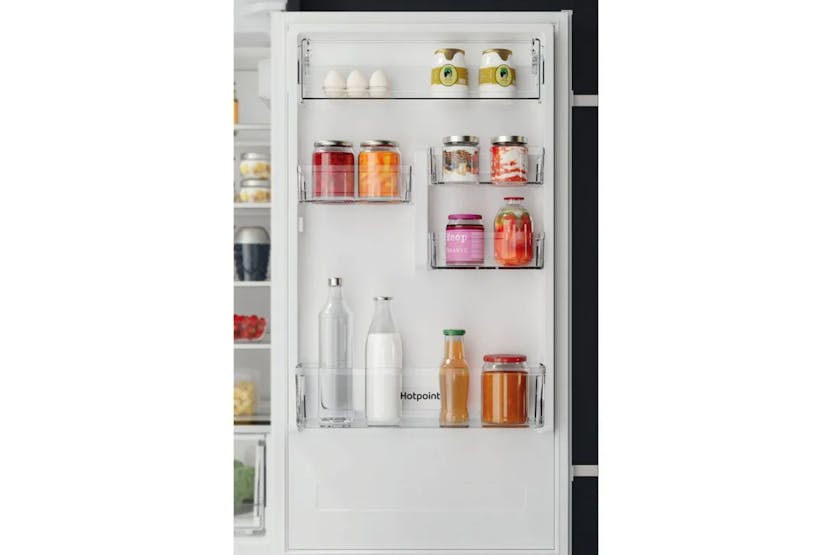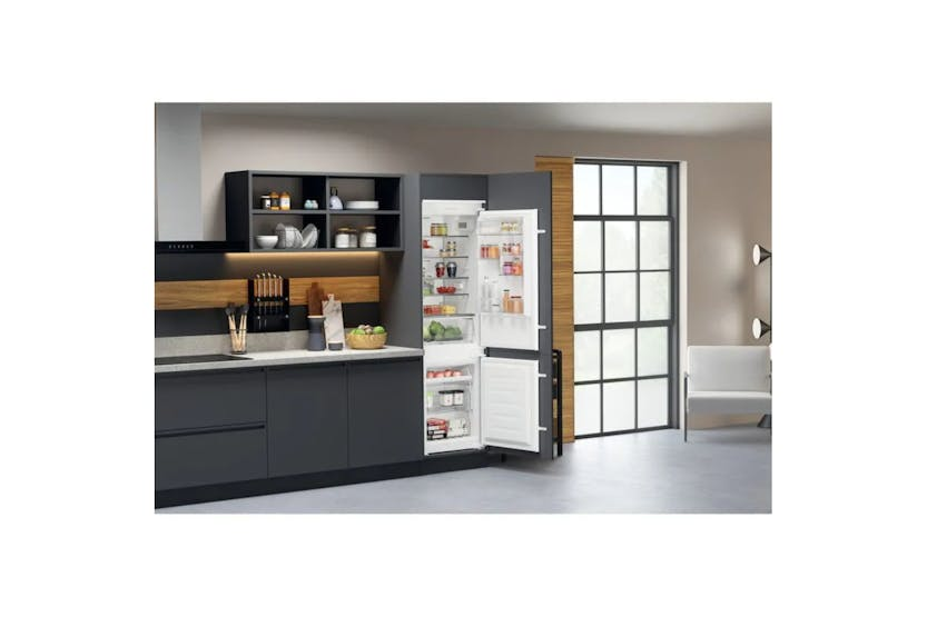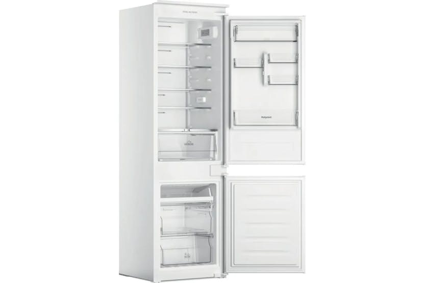 The Hotpoint Integrated Fridge Freezer HTC18T112UK offers Total No Frost technology to prevent moisture and ice build-up, ensuring your food stays fresh longer and eliminating the need for defrosting. With Active Fresh technology, the fridge maintains a precise temperature and quickly recovers after the door has been left open. The Fresh Zone+ drawer keeps fruit and vegetables fresh for up to 2 weeks, while the Temperature Alarm alerts you to any unexpected temperature changes. This energy-efficient fridge freezer also features glass shelves, a convenient bottle balcony, and a sleek white design, making it a practical and stylish addition to any kitchen.