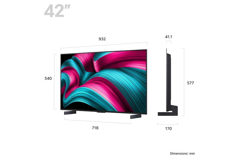 Experience the ultimate in visual detail with the LG 42" C5 OLED Evo 4K Smart TV. Powered by the alpha 9 AI Processor Gen8, this TV delivers next-level image quality by analyzing and upscaling every frame with enhanced facial expressions and depth. Enjoy brighter visuals, perfect black levels, and vibrant colors with features like Brightness Booster, Perfect Black, and Perfect Colour, certified for 100% Color Volume and Fidelity. The AI Picture Pro, AI Magic Remote, and AI Voice ID provide a seamless and personalized viewing experience, while the AI Concierge, Picture Wizard, and Sound Wizard offer advanced customization options for sound and picture preferences. With upgrades for 5 years through the webOS Re:New Program, enjoy the latest features and software updates while keeping your privacy and data secure. Transform your TV into the ultimate entertainment hub with features like Multi View for multiple screens, LG Channels for free streaming content, and the Gaming Portal for access to thousands of games. Enjoy peak gaming performance with G-Sync compatibility, Dolby Vision, Dolby Atmos, and Ambient FILMMAKER MODE for a cinematic experience. The ultra-slim design and USB camera compatibility add convenience and versatility to your viewing experience. With hands-free voice control, intelligent voice recognition, and the Home Hub