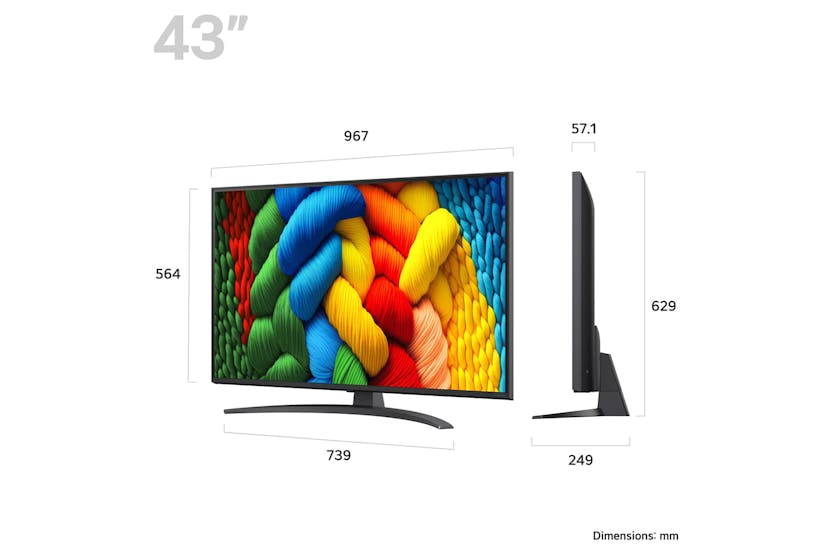Experience stunning picture quality and immersive sound with the LG NANO81 43" 4K Ultra HD HDR LED Smart TV. Powered by the Alpha 7 AI Processor Gen8, this TV delivers vivid colours, sharp details, and enhanced resolution. With AI features like Voice ID, AI Chatbot, and AI Sound Pro, you can personalize your viewing experience like never before. Plus, with the webOS Re:New Program, you'll receive annual upgrades for 5 years, ensuring your TV stays up-to-date with the latest features and software. Upgrade your entertainment experience with the LG NANO81 43" Smart TV. Immerse yourself in a world of authentic colour and powerful performance with the LG NANO81 43" 4K Ultra HD HDR LED Smart TV. Enjoy pure colours in real 4K, 4K super upscaling, and all-encompassing surround sound with virtual 9.1.2 channels. The AI features like AI Voice ID, AI Search, and AI Concierge make controlling your TV effortless, while the Filmmaker Mode ensures you experience cinema-quality visuals. With the LG NANO81, you'll enjoy a personalized and immersive viewing experience that will elevate your entertainment.