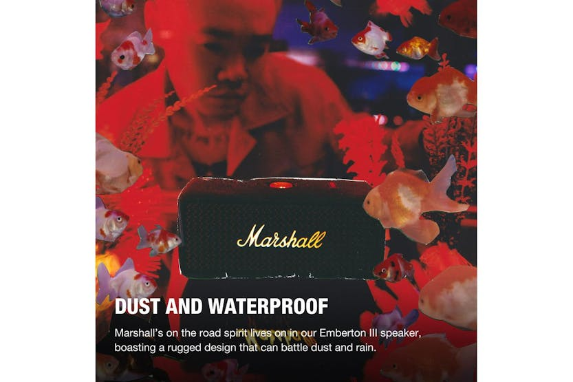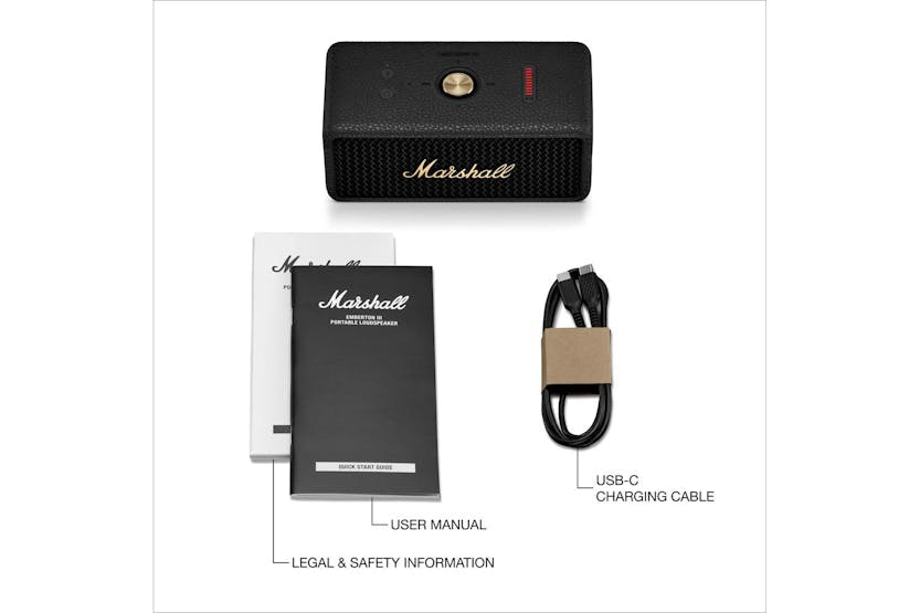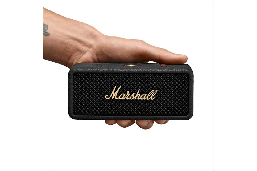 Experience the ultimate in portable Bluetooth speakers with the MARSHALL Emberton III Black Brass (D2C). This rugged speaker delivers iconic Marshall sound quality and 360° True Stereophonic technology in a compact design, perfect for outdoor adventures. With a 32+ hour battery life, IP67 dust and waterproof rating, and sustainable materials, this speaker is the perfect blend of high-end sound and lifestyle convenience. Elevate your audio experience with the MARSHALL Emberton III Black Brass (D2C) and enjoy unrivalled sound quality wherever you go.