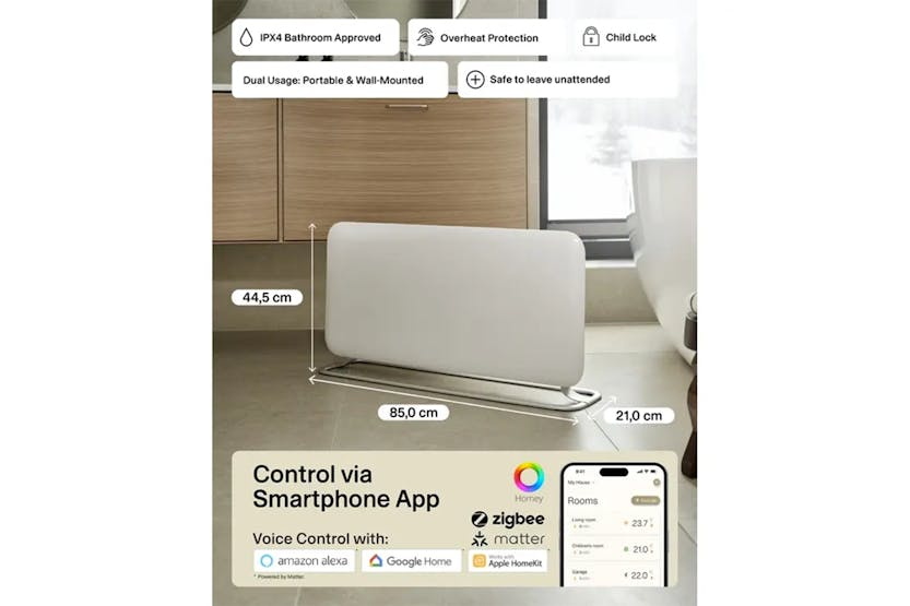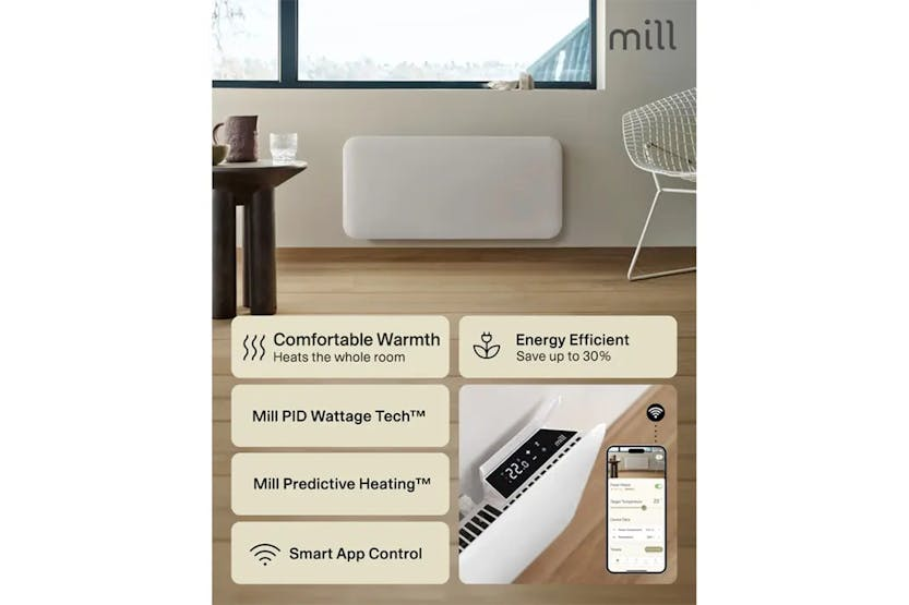 Description Check out the video: Mill Invisible Smart WiFi Panel Heater generation 4 is a high-tech and energy-efficient panel heater with a clean, modern look that blends seamlessly into all types of homes. With support for Matter, Zigbee 3.0 and WiFi, this is one of the most future-proof heaters on the market – ready for the smart home, whatever platform you use. In the Mill app, you can easily control the temperature from anywhere and see your power consumption at all times. With the weekly program, the temperature will automatically adapt to your daily routines, ensuring optimum comfort and avoiding unnecessary power consumption when you’re away or asleep. The heater is equipped with Mill Predictive Heating and Mill PID Wattage Tech, which uses machine learning and precise power control to keep the temperature stable with the lowest possible power consumption. You get an energy-efficient and comfortable heating experience that adapts to your habits and the needs of the room. The elegant, rounded front and sleek design make it blend in with the wall. The panel heater provides comfortable heat, is quiet, has a low surface temperature, can be safely left on unattended, and is IPX4 approved for use in bathrooms. Mill Pid Wattage Tech First panel heater with PID control heating technology. When desired temperature is reached, the heater will maintain this temperature by lowering the power level, resulting in a more stable heating with less fluctuation in temperature. Mill Predictive Heating The panel heater will heat the room so that the desired temperature is reached at a specific time. The heater learns how fast the room goes up/down in temperature over time. That way, it will know when to start heating to achieve your desired temperature at the time you have scheduled in the Mill-app. Easy Connection Seamless and easy connection with Bluetooth that automatically connects the device to your WiFi-network, regardless of the type of router you have. Silent Operation Mill WiFi panel heaters are silent when operating, which means there is no clicking sound when the temperature goes up and down. Child Safety Lock Activate the child lock in the Mill app to lock all buttons on the control panel of the heater. This prevents nosy little fingers from adjusting the temperature or turn the heater on and off. Commercial Lock Ensures that you as a landlord have control over the temperature and electricity consumption in the rental properties in the Mill app. The World’S First Panel Heater with Matter Mill WiFi generation 4 panel heaters now come with Matter support, so you can control the temperature in the same app as your other smart home products, if you wish. With Matter you can now easily regulate the temperature with voice control via Amazon Alexa, Apple Home and Google Home. All Mill WiFi products (except Gen 1) can also be controlled via Homey. Safety & Installation Easy to install yourself Wall bracket and screws included Cord length: 1300 mm right side Safe to leave unattended Bathroom approved: IPX4 Overheat protection Child safety lock Commercial Lock Connectivity Easy connection to WiFi via Bluetooth 5.2 Connectivity: WiFi 2.4 Ghz (WiFi 6). Zigbee 3.0 Integrations: Matter (Google Home, Apple Home, Amazon Alexa etc.), Homey, Tibber Local REST API Open API Product Features: Complements the modern home Energy efficient: Reduced energy consumption Power: 1500W Recommended room size: 18-22 m² Matter compatible LED Display for easy reading Heating element: X-aluminium – high efficiency, low surface temperature (max. 55 °C) Fast and even distribution of heat in the whole room Low energy control Mill PID Wattage tech Mill Predictive heating Open window function Silent operation Dimensions: 850 x 210 x 445 mm (W x D x H) Read More