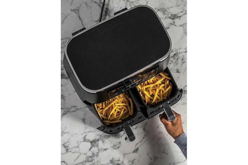 The Ninja 7.6L Foodi Dual Zone Air Fryer offers more than just air frying, with 6 different cooking methods to choose from. With 2 independent cooking zones, you can mix and match cooking programs, times, and temperatures to create delicious meals in moments. Enjoy up to 75% faster cooking than fan ovens, with up to 75% less fat, making guilt-free fried food a reality with little to no added oil. The extra-large capacity can feed up to 8 people, making it perfect for families or entertaining guests. The easy-to-use digital control panel with a countdown timer and variable temperature controls allows you to customize your cooking experience. The innovative Auto-Adjust Fan automatically changes speeds based on the cooking function selected. Included are 2 non-stick crisper plates and 2 non-stick drawers, making cleanup a breeze. Elevate your cooking game with the Ninja Foodi Dual Zone Air Fryer for quick, delicious meals every time.