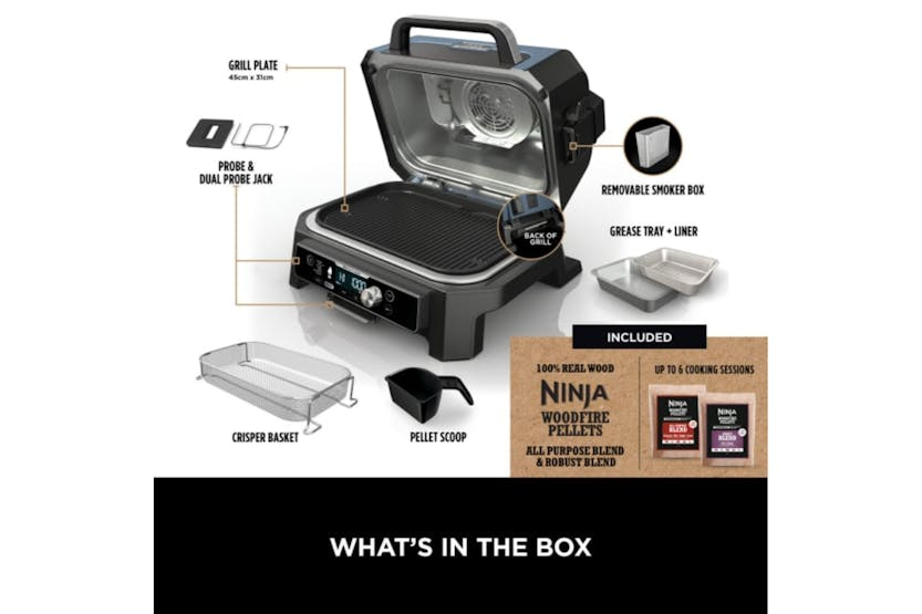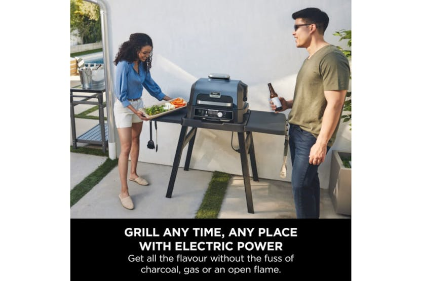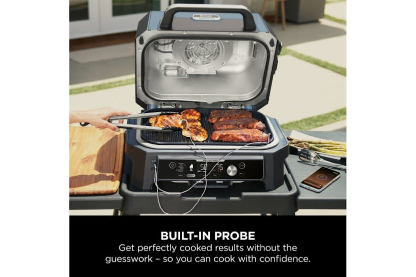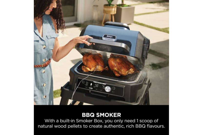 The Ninja Woodfire Pro Connect XL Electric BBQ Grill & Smoker in Blue/Black allows you to control your BBQ from your phone with the Pro Connect app, giving you the freedom to relax and enjoy time with loved ones. With built-in probe and 7 functions including BBQ grill, smoker, air fry, bake, roast, dehydrate, and reheat, this grill offers authentic smoky flavors with natural wood pellets, all powered by electricity for easy and safe outdoor use. Plus, with a large grill capacity fitting up to 10 burgers or 2 whole chickens, you can host big BBQ gatherings with ease. Experience the convenience and versatility of the Ninja Woodfire Pro Connect XL Electric BBQ Grill & Smoker. Control your cooking progress from your phone with the Pro Connect app, while enjoying the authentic smoky flavors of woodfire technology. With a large grill capacity and 7 cooking functions, this electric BBQ grill is perfect for hosting gatherings and creating delicious meals outdoors. Built with premium materials for year-round outdoor use, this BBQ grill offers a hassle-free and safe alternative to traditional charcoal and gas grills.