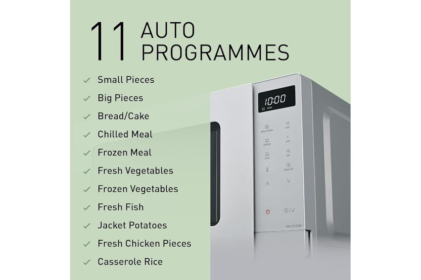 Upgrade your kitchen with the PANASONIC MICR20S 20L Solo Microwave in Silver. This sleek and compact microwave offers 5 power settings, 8 automatic programmes, and 3 defrost modes for efficient cooking. With features like Quick 30 and Add Time functions, cooking has never been easier or more convenient. Bring sophistication and functionality to your kitchen with this stylish and powerful microwave from PANASONIC. Experience the perfect blend of style and performance with the PANASONIC MICR20S 20L Solo Microwave in Silver. With 800W power consumption and a White LED Backlit Digital Display, this microwave offers clarity and precision in cooking. The auto reheat function, quick defrost modes, and adjustable heat settings ensure that your dishes are cooked to perfection every time. Upgrade your culinary experience with this innovative and reliable microwave from PANASONIC.