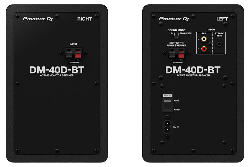 Experience powerful and balanced sound with the Pioneer DJ DM-40D-BT 4" Desktop Monitor Speaker with Bluetooth in black. Featuring a Class D amplifier and 4-inch woofer, these speakers deliver punchy bass and crystal-clear high frequencies with grooved ducts for tight, punchy bass. Switch between DJ mode and Production mode for optimized sound, and easily connect your devices with Bluetooth technology. Perfect for both DJing and music production, these speakers offer a wide sweet spot and 3D stereo sound for an immersive listening experience. Included with the speakers are a power cord, audio converter cable, speaker cord, and bottom cushion for easy setup. With dimensions of 146 x 227 x 223 mm for the left speaker and 146 x 227 x 212 mm for the right speaker, these compact yet powerful speakers are ideal for any home studio or professional setup. Elevate your sound experience with the Pioneer DJ DM-40D-BT speakers.