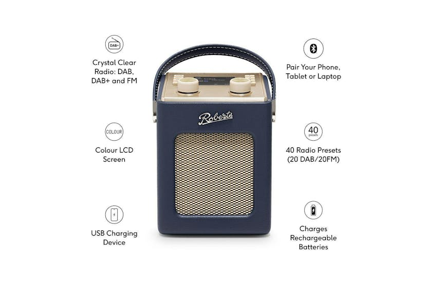 • Specs • General • Brand • Roberts • Product Category • TV & Audio • Product Type • Portable Radio • Product Colour • Midnight Blue • Audio & Docking Special Features • Additional Features • LCD Display • Compatibility • Compatibility • Bluetooth Enabled Devices • Power • Power Source • Battery & Main • Dimensions • Height • 182 mm • Width • 145 mm • Depth • 142 mm • Weight • 1.236 kg