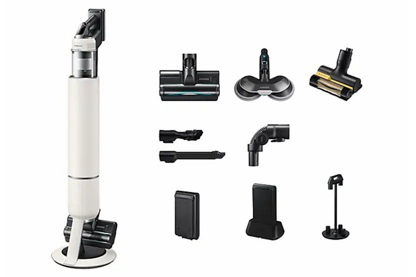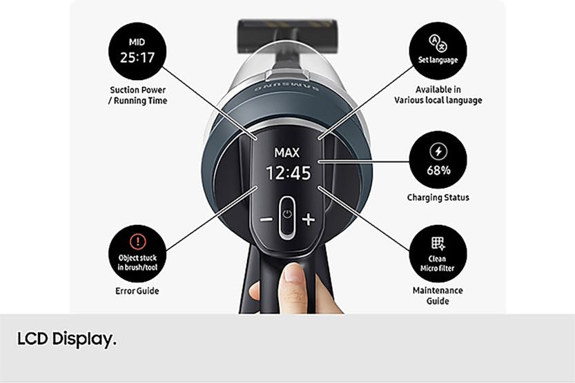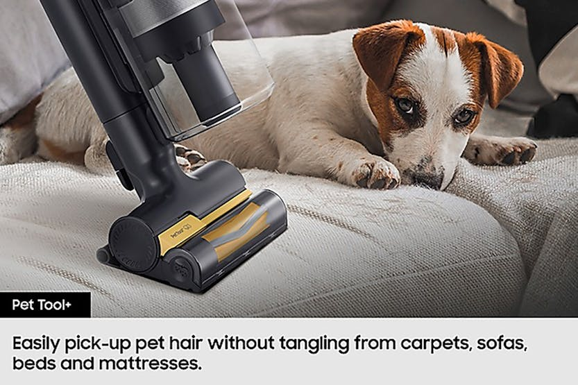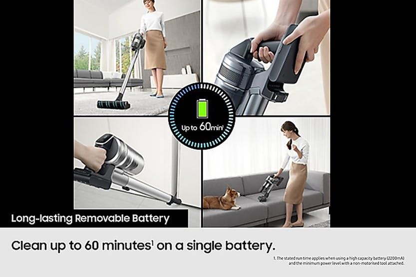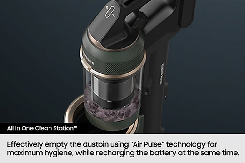 Description Intelligently Powerful Enjoy efficient, effortless and intelligently enhanced cleaning and clean air. It is light and powerful, with suction power of up to 280W*. AI Cleaning mode 2.0 adjusts its performance in more diverse cleaning environments***. And HEPA Filtration reduces fine dust**** escaping into the air. Powerfully Effective, but Lightweight: More Advanced Cleaning Performance Enjoy powerful suction with the cordless Bespoke Jet AI stick vacuum cleaner. The HexaJet Motor generates power of up to 280W with multi-cyclonic air filtration for better performance on all floors. [1] Intelligently Cleans Different Floor Types: AI Cleaning Mode 2.0 (With Jet Dual Brush+) Clean your home thoroughly and efficiently with an intelligently enhanced performance. Using Samsung’s AI Optimum Tech, AI Cleaning mode 2.0* with Jet Dual Brush+ classifies diverse cleaning environments, such as hard floor and different carpet types, by sensing the brush load and vacuuming air pressure. It automatically adjusts settings, like suction power, to deliver the same performance as Mid mode, while reducing battery power use by 14% and increasing maneuverability by 8%**. [2] Releases Clean Air: HEPA Filtration System Breathe clean that contains much less dust* while you are cleaning*. The HEPA Filtration system, with an upgraded fine dust filter and finely tuned machine sealing, effectively captures fine dust** and prevents it escaping into the air. So it releases pure air and helps to keep your home clean. [3] All-in-One Emptying, Charging & Storage: All in One Clean Station Empty easily and hygienically with the all-in-one Clean Station and charging unit. “Air Pulse” technology empties the bin, removing 99% of hair* and trapping 99.999%** of fine particles without dust escaping. With Air Spin edge technology, a cyclone spins powerfully to remove hair without tangling and emits only clean air as it automatically shuts the dustbin. [5] [4] Clean with Ease Continuously: Lightweight Design* with High Performance Enjoy the flexibility of cleaning. A lightweight design with high performance is ideal for everyday use, from quick tidy-ups to thoroughly cleaning your home. With the handheld body weight just 1.45kg, and the enhanced maneuverability, you can move around effortlessly, easily and perfectly clean. [5] Check out the video: Extremely Powerful and Ultra Lightweight: HexaJet Motor (280W) With strong suction power and great mobility, the light* HexaJet Motor gives effective, effortless cleaning with innovative design and a 10-year Digital Inverter Motor** warranty. Spinning at up to 132,000rpm with up to 730W*** of input power creating 280W**** of suction, it maintains a high levels of suction power throughout your clean. [6] Clean Up to an Hour on a Single Battery: Removable and Longer Lasting Battery Clean up to an hour* on a single battery for long cleaning times without recharging. Samsung high-capacity battery maintains consistent power for up to 1 hour(1), and can be easily replaced with a spare battery to clean for up to 2 hours** Retaining 70% of its original performance for up to 500 cycles***. [7] Check out the video: Customised Cleaning and Maintenance: Smart Wi-Fi Uniquely optimised for you and your home, you can customise your vacuum settings for optimal cleaning and convenience. With the SmartThings App, Smart Wi-Fi lets you adjust and manage multiple functions and settings, tracking and reporting on your cleaning history with smart self-diagnosis to checks its status for a customised maintenance guide. [8] Check out the video: Releases Clean Air: 99.999% Multi-layered Filtration System Release clean air with a Multi-layered Filtration system that traps 99.999%* of dust**. A main cyclone separates large dust particles, which are picked up in a metal mesh grille filter. The Jet Cyclone and micro filter then catch fine dust particles. And a fine dust filter traps micro dust**. [9] Fully Washable Bin: Washable Dustbin Keep the dustbin hygienically clean and empty the vacuum cleaner easily. The whole 0.5L dustbin, including the multi-cyclone system, is fully washable, so it can be kept clean and fresh*. It can also be removed easily without detaching the pipe from the body, so you can simply tip out the dust. [10] Check the Status at a Glance: LCD Digital Display Check the status at a glance to control and maintain your vacuum cleaner intuitively from the multi-language LCD diagnostic display. Check which of the five suction levels it is set to and remaining battery time at a glance. Get alerts for any problems, with the smart display telling you what to do as well as displaying the battery level when charging. Vacuuming You Can Handle: Telescopic Pipe No more crouching or craning when you're vacuuming. We've got your back with this adjustable, telescopic pipe. There are four different sizes, so you can extend or lower the stick to make it more comfortable for your height. Plus, those hard-to-reach nooks and crannies won't be a problem anymore. All-in-One Storage: Accessory Cradle Keeping all your Samsung cordless vacuum attachments in one place is simple thanks to the Accessory Cradle. It also means you can carry them easily to wherever you need to clean. Plus, you can use the Cradle to efficiently charge a spare battery to suit your lifestyle and usage. So, even if you don't use it frequently, it will always be ready to use when and where you want it. Check out the video: Removes Hard to Catch Pet Hair: Pet Tool+ Easily pick-up pet hair without tangling from carpets, sofas, beds and mattresses. The Pet Tool + is optimised for picking up pet hairs that are often thin and easy to miss, and the rotating brush is enhanced by a combination of a rubber nozzle and bristles*. With a V-shaped drum collecting hair in the centre and cutting it up with a self-cleaning grinder**. [11] Check out the video: Picks Up Dust and Hair Effectively: Jet Dual Brush+ Enjoy an outstanding cleaning performa