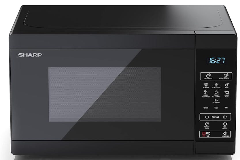 Description 900 Watt Digital Microwave The 25L capacity and sleek black handle-less design makes this the ideal microwave oven for any kitchen. Touch Control and Digital Display Easy to read blue LED screen shows the time when the microwave is not in use, and features a handy kitchen timer function & child safety lock. Powerful Cooking at Home Comes complete with 8 automatic programmes and 11 levels of power, including drink reheat, plate reheat and time/weight defrost settings. Easy to Use Counter-top Microwave The adjustable timer helps you ensure your food is cooked ideally, while the flat contours are designed to be easily wiped clean. Turntable Inside Cooks and re-heats food evenly and quickly. Enjoy soups, jacket potatoes, popcorn, mug brownies and more. The Sharp is a 900W solo microwave with a digital touch control panel. It's contemporary look will compliment your modern kitchen. The blue LED display functions as a clock when the microwave is not in use and can also be used as a kitchen timer. Easy to use and with a large capacity, 11 power levels and 8 automatic cooking programmes - this is a great option if you are looking for a microwave for a medium to large family household. Large Capacity Featuring a 25 litre capacity, it can easily hold a large sized dinner plate, perfectly holds the grill rack and the 288mm glass turntable. Digital Touch Panel The digital touch control panel makes selecting your programmes easy and along with the rest of the Microwave can be easily wiped clean. Cooking Features 8 cooking programmes; popcorn, jacket potato, pizza, frozen vegetables, reheat drinks, reheat dinner plate, plus time and weight defrost. Product Features: Material: Glass, stainless steel Straight design easy to clean