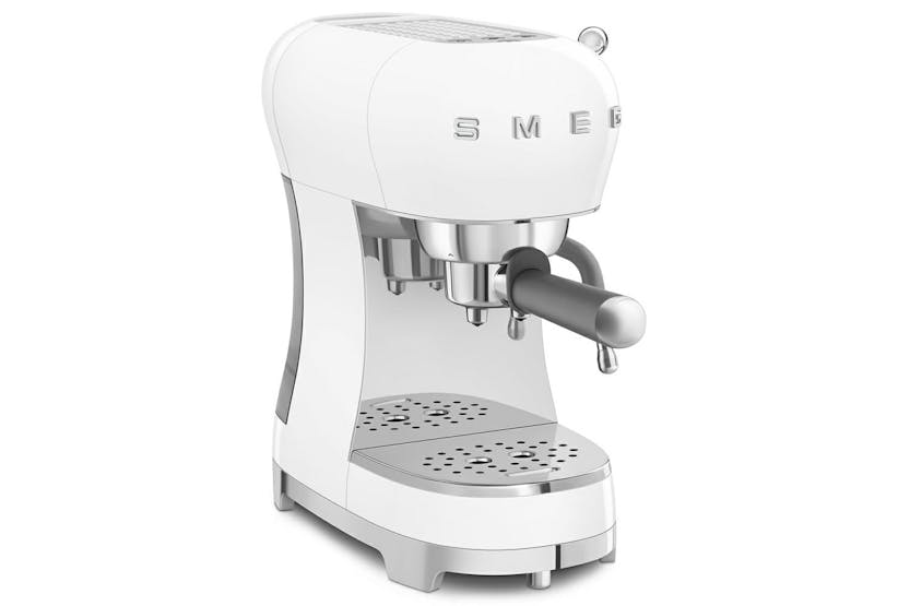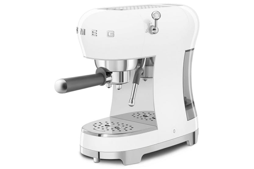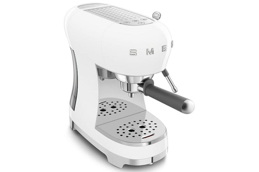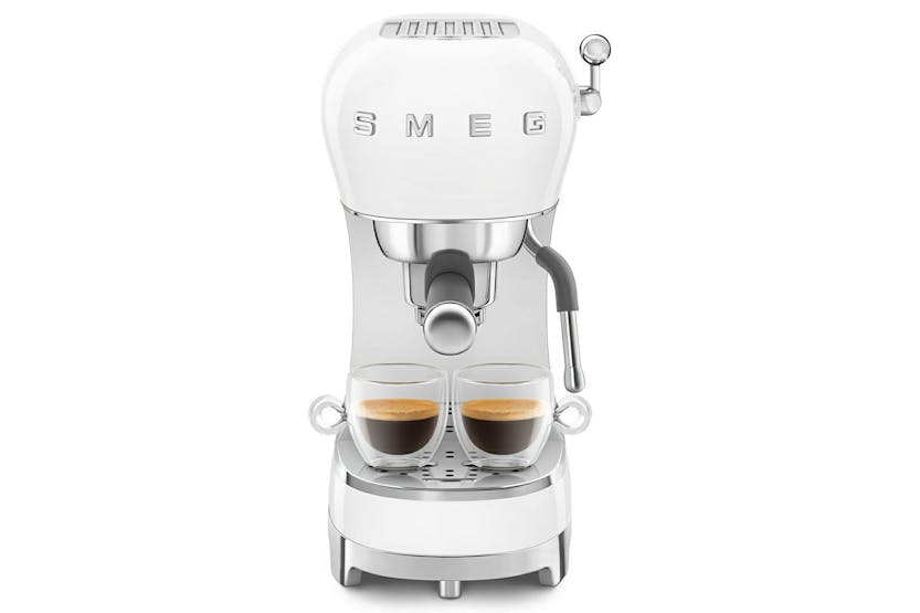 Experience the perfect blend of style and functionality with the Smeg 50's Retro Style Espresso Coffee Machine in White. Made in Italy with a renewed design, this espresso machine offers convenient usability with its control panel featuring 4 espresso functions and a steam wand for creamy milk foam. Enjoy a quick and precise brewing process with the Thermoblock heating system and 15 bar pressure, promising the best results for an excellent espresso. Upgrade your coffee experience with the Smeg ECF02 coffee machine. The ECF02 Espresso Coffee Machine features a removable water container, bigger cup housing, and adjustable settings for coffee length and water hardness. With a sleek white design and a combination of aesthetics and reliability, this Smeg coffee machine is the perfect addition to any kitchen. Elevate your coffee routine and indulge in the intense aroma of a real Italian espresso or a creamy milk froth with the Smeg 50's Retro Style Espresso Coffee Machine.