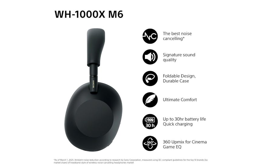 Description Introducing the Sony WH-1000XM6 Noise Cancelling Wireless Bluetooth Headphones. Experience the best noise cancelling. Powered by Sony’s newly developed HD Noise Cancelling Processor QN3 and 12 precision mics, Multi Noise Sensor Technology captures and cancels environmental noise with exceptional accuracy. Auto NC Optimizer adapts to your environment. The WH-1000XM6 deliver Sony's best ambient sound in over-ear headphones too. Developed in collaboration with leading mastering engineers, enjoy premium sound quality, with 30mm driver units, the advanced HD Noise Cancelling Processor QN3, Hi-Res Audio support, DSEE Extreme, and a customisable 10-band equaliser in the Sony | Sound Connect app. The headphones are foldable, with a newly designed carry case. They are comfortable, and available in Black, Silver, or Midnight Blue to suit your style. Other features: Up to 30hr battery life, quick charging, 360 Upmix for Cinema, Game EQ, Sony’s best call quality yet, and Multipoint Connection. The best noise cancelling* Powered by the new HD Noise Cancelling Processor QN3 and 12 precision microphones, Multi Noise Sensor Technology captures and cancels environmental noise with exceptional accuracy. On a busy street or soaring at 30,000 feet, the Auto NC Optimizer adapts for optimal performance. The WH-1000XM6 also offer Sony's best ambient sound in over-ear headphones. Auto-Ambient Sound Mode adjusts the ambient sound level based on noise around you, ensuring a perfect balance between your music and surroundings. Signature sound, co-created with the masters Developed in collaboration with Grammy Award-winning mastering engineers, and building on the world-renowned signature sound quality of the award-winning 1000X series, the WH-1000XM6 delivers the most exceptional sound experience yet. With a 30mm driver unit, HD Noise Cancelling Processor QN3, Hi-Res Audio certification, DSEE Extreme to upscale every track, and a customisable 10-band equaliser, you will hear every beat and nuance with stunning accuracy. Foldable design, durable case The WH-1000XM6 features an innovative folding mechanism with durable metal hinges, allowing these noise cancelling headphones to pack down into a compact size for easy storage and portability. The newly designed carry case provides excellent protection with a convenient magnetic closure, replacing the traditional zipper for easier access. Ultimate comfort Available in Black, Silver, or Midnight Blue, the WH-1000XM6 offers a lightweight, stable design for all-day wear. We’ve improved the headband from previous models, making it even more comfortable and secure. Soft, cushioned earpads provide a premium feel, ensuring hours of effortless listening - whether you’re on a long flight, handling your daily tasks, or simply winding down at home. With a refined fit and timeless style, these Sony headphones offer a new level of comfort. All-day listening With up to 30 hours of battery life*, the WH-1000XM6 is designed to keep up with your day. From your morning commute to a late-night playlist, you'll have all the power you need to stay immersed in your music, podcasts, or calls. Running low on power? A quick 3-minute charge provides an impressive 3 hours of playtime** - perfect for those last-minute boosts. Plus, you can use the WH-1000XM6 while charging, ensuring you’ll never be without your music for long. *With Noise Cancelling On **With USB PD Charger (sold separately) Not just for music New to the 1000X series, the WH-1000XM6 introduces 360 Upmix for Cinema. This innovative technology transforms regular stereo content, from streamed TV shows to blockbuster movies, into immersive surround sound, with audio coming from the sides, behind, and even above you. Game EQ offers sound settings designed to enhance clarity and detail during gameplay. Perfect for casual gamers who prefer headphones over a traditional gaming headset. Exceptional call quality, powered by AI With 6 AI-powered beamforming microphones - two more than the award-winning WH-1000XM5 - these headphones accurately capture your voice for crystal-clear conversations, even in the busiest environments. AI Noise Reduction filters out unwanted sounds, ensuring exceptional clarity wherever you are. And for added convenience, you can mute and unmute calls directly from the headset. Connect two devices at the same time With Multipoint Connection, you can connect two devices to the WH-1000XM6 via Bluetooth simultaneously, and seamlessly switch between them. So, if you’re watching a movie on your laptop, but then get a phone call, the headphones will switch over automatically. What’s even better is that it doesn’t matter if you’ve got an iPhone, Android, PC, or Mac - these wireless headphones work cross-platform, so can stay connected to any two of them, at the same time.