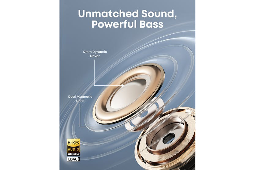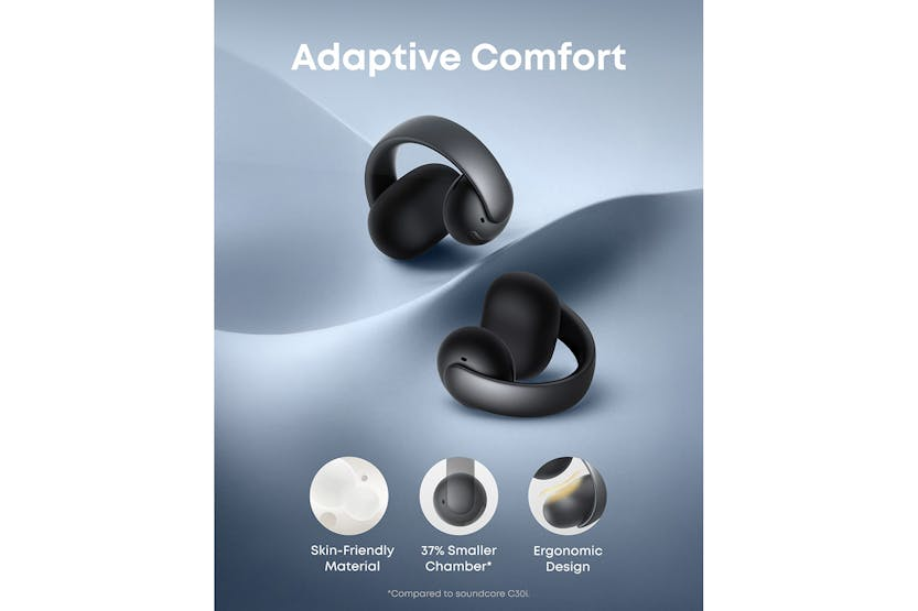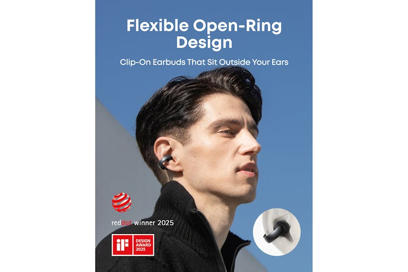 Experience unparalleled comfort and sound quality with the Soundcore Aeroclip Earbuds in black. The innovative open-ring design ensures a perfect fit for all ear sizes, while the virtual bass technology delivers powerful lows and clear audio across all frequencies. With 3× clearer calls, IPX4 water-resistance, and customizable controls via the Soundcore app, these earbuds are the perfect choice for all your outdoor adventures. Stay stylish and comfortable all day long with the Soundcore Aeroclip Earbuds. The flexible and secure fit, adaptive open-ring design, and AI-boosted clear calls make these earbuds a must-have accessory for music lovers on the go. Choose your own fit with two sizes of attachable ear grips and enjoy flawless audio quality with a touch of chic flair in three vibrant colors.