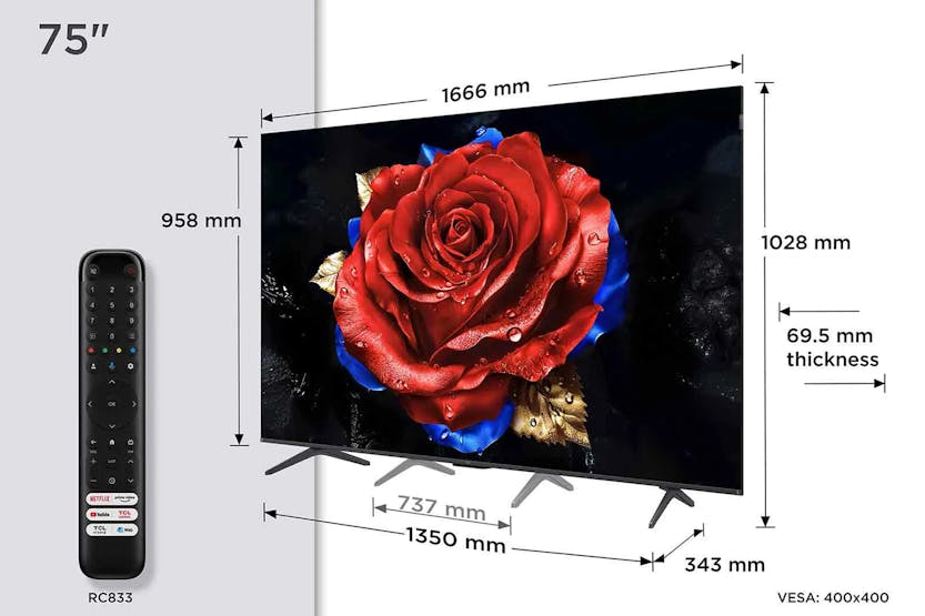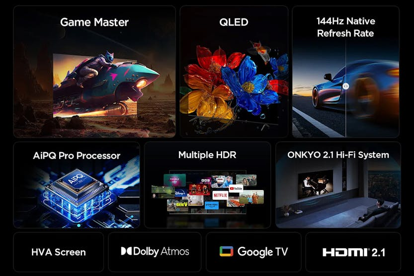 Experience next-level gaming with the TCL 75'' QLED 4K HDR Smart TV | 75T8C. Featuring 144Hz Motion Clarity PRO for smoother gameplay, Game Picture Mode for immersive experiences, and Superwide Gameview for a wider field of view, this TV is designed for hardcore gamers. With QLED technology delivering over a billion hues of vivid color, ONKYO 2.1 Hi-Fi System with Dolby Atmos for immersive audio, and HDMI 2.1 for top-notch viewing quality, this TV offers a truly exceptional entertainment experience. Plus, with Google TV, multiple eye care technologies, and a sleek uni-body design, this TV combines cutting-edge technology with stylish design for the ultimate viewing experience. Unlock advanced display and audio technology with the TCL 75'' QLED 4K HDR Smart TV | 75T8C. Featuring a range of gaming enhancements like Low Latency Mode, Aiming Aid, and Allm, this TV is perfect for gamers looking for a competitive edge. With TCL's innovative AiPQ Pro Processor, HVA Screen technology, and multiple HDR support, you can enjoy stunning picture quality with enhanced contrast and detail. The ONKYO 2.1 Hi-Fi System with Dolby Atmos delivers immersive sound, while