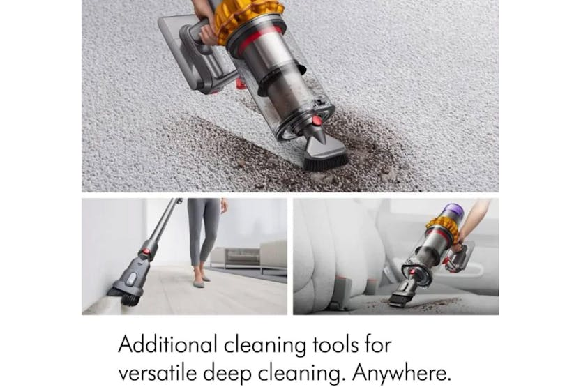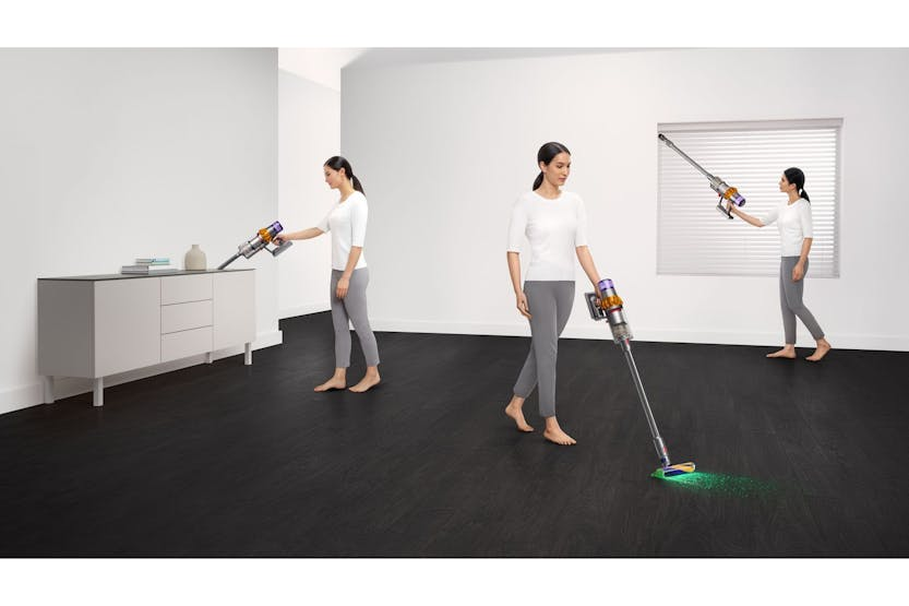 Description Machine Highlights The Most Awarded Cordless Vacuumš The Dyson V15 Detect Absolute cordless vacuum generates 240 air watts of powerful fade-free suction' with up to 60 minutes run time to deep clean your whole home . Dyson Illumination Technology Reveals Invisible Dust on Hard Floors Fluffy Optic cleaner head illuminates the microscopic dust and dirt you canât normally see on hard floors â revealing 2x more invisible dust. Brighter illumination reaches 300mm â so you donât miss anything.² Measures Microscopic Dust Particles A piezo sensor continuously sizes and counts dust particles â automatically increasing suction power when higher dust volumes are identifiedâ´. Scientific Proof of a Deep Cleanâ´ LCD screen calculates and categorises sucked-up particles â showing you whatâs been removed as you cleanâ´. Core Technologies Dyson Hyperdymium Motor The Dyson Hyperdymium motor spins at up to 125,000rpm generating 240 air watts of powerful fade-free suctionâľ. Root Cyclone Technology Dyson's patented cyclones generate centrifugal forces of up to 100,000g trapping fine dust and dirt in the bin, so your vacuum never loses suction. Energy-Dense Battery Advanced seven-cell click-in battery delivers up to 60 minutes of fade-free power to deep clean your whole home5. Whole-Machine Advanced Filtration Dysonâs fully-sealed filtration system captures dust and seals in 99.99% of microscopic particles and allergens as small as 0.3 microns - expelling cleaner air into your home7. De-Tangling Digital Motorbar Cleaner Head Powerfully sucks up dust and hair from all floors. Hair removal vanes automatically clear hair from the brush bar. Intelligently Adapts to Floor Types In Auto mode, Dyson DLS technology inside the Digital Motorbar cleaner head monitors brush bar resistance 360 times a second, intelligently adapting power across different floor types. The Power to Clean Anywhere The versatility of Dyson cordless technology makes cleaning your home easier. Powerful cleaning of floors, hard-to-reach places and mattresses. Fluffy Optic Cleaner Head 25cm-wide cleaner head engineered with soft nylon and anti-static carbon fibre filaments to remove dust from hard floors and narrower gaps. With a low profile to reach further under furniture. The Right Cleaning Mode for the Right Task. Three cleaning modes optimized for a variety of tasks. The right balance of power and run time where you need it. Intelligently Reports in Real Time Digital display shows run-time countdown to the second and displays maintenance alerts, giving you complete control of your clean. Easy to Maintain The filter and Fluffy brush bar can be washed, and the bin and tools wiped clean, to remove dust build-up and help optimize your Dyson vacuumâs performance. Click-in Battery Remove and replace at the press of a button for even longer cleans. Click-in batteries can be charged on or off the machine. Digital Motorbar Cleaner Head Motorised, edge-to-edge deep cleaning with de-tangling technology. Intelligently adapts to different floor types. Illuminated Cleaner Head Soft roller cleaner head for hard floors with a precisely-angled beam which detects the particles you canât normally see â so you donât miss anything. Combination Tool Two tools in one - brush and wide nozzle. For simple switching between tasks. Crevice Tool Designed for precise cleaning around edges and narrow gaps. Wall Dok Wall-mounted Dock to recharge your vacuum and tidily store tools. Charger Charges your vacuum with or without the Wall Dock. Notes: 1. Based on cordless market as of July 2022 â July 2023 2. Compared to the original Dyson Laser Slim Fluffy cleaner head. Effectiveness influenced by ambient light conditions, debris type and surface 3. Dynamic Load Sensing technology only applies in Auto mode with the Digital Motorbar⢠cleaner head attached 4. Best accuracy achieved in Auto mode. Auto ramp feature in Auto mode only. Testing based on average in home usage according to Dyson internal test data 5. Applies in Eco mode on hard floor. Actual run time will vary based on power mode, floor type and/or attachments used. 6. Suction tested to EN IEC62885-4 CL5.8 and CL5.9, tested at the flexible inlet, loaded to bin full, in Boost mode against the cord-free stick market. (Sales data from Apr 2020 to Mar 2021) 7. Filtration tested against EN60312-1 CL 5.11 in Boost mode 8. Based on awards from Top 20 Publishers in the UK received by cordless vacuum cleaners sold by Dyson in the GB market as of July 2022 â 2023. This includes the Dyson V8, Cyclone V10, V11, V11 Outsize, V12 Detect Slim, V15 Detect, Gen5detect, Outsize, Omni-glide and Micro 1.5KG Product Features: The most awarded cordless vacuumš 240 air watts of powerful fade-free suctionâś with up to 60 minutes run time to deep clean your whole homeâľ Fluffy Optic cleaner head reveals twice the amount of invisible dust on hard floors². Digital Motorbar cleaner head powerfully removes dirt and dust, automatically de-tangling hair and adapting suction across different floor typesÂł Piezo sensor intelligently adapts suction when more dust is identified. LCD screen shows scientific proof of a deep cleanâ´ Read More DYSON V15 Detect Absolute Cordless Vacuum Cleaner