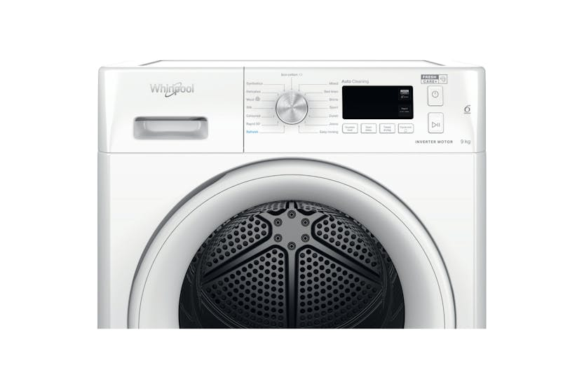 Description Delivery Only - Free Shipping! 6th Sense Technology 6th Sense automatically detects the amount of laundry and sets the right drying cycle time, guaranteeing the desired dryness level, with time and energy optimization. Capacity The dryer's drum capacity, measured in kilograms. 9 Kg Capacity All the space you need.With an outstanding 9kg drum capacity, this Whirlpool Dryer provides all the space you need for your laundry. Silence The Dryer's noise-level, measured in decibels. Very Quiet Enjoy the silence.This Whirlpool Dryer is designed to provide ideal results, while functioning at very low noise levels, so you can enjoy some extra peace and quiet. Energy Rating The dryer's energy rating. The higher the rating, the higher the energy-efficiency of the product. Design Distinctive aesthetic elements, such as user-friendly illustrations, intuitive ergonomic controls, and other attractive design features. Freshcare + Keep your garments fresh up to 6 hours after the cycle is over. Innovative FreshCare+ system takes care of your garments inside the dryer thanks to intelligent delicate temperature control and delicate tumbling action that keep garments fresh and prevent bad odours. FreshCare+ treatment leaves truly fresher clothes and peace of mind - even hours after the end of the cycle. FreshCare+ treatment inhibits the proliferation of the main bad odour sources (inside the dryer) up to 6 hours after the drying ends. Not compatible with programmes designed for delicate garments and with extra and cupboard drying levels. Autocleaning Condenser Filter No more time spent cleaning condenser filter- the dryer completes the task in your place. Woolmark Blue The beauty of wool always preserved. Senseinverter Motor A highly energy efficient motor working at variable speed, allowing more advanced performances and thus special care for fibers. Big Items Program Extra spacious-your laundry gets all the space it needs. And with the Big Items program even the bulkiest loads will be perfectly dry. WHIRLPOOL FFT M11 9X2Y UK Dryer dimensions (cm) 84.9 height 59.7 width 64.9 depth colour White capacity (KG) 9 washing Product Information This Whirlpool Heat Pump Dryer has a spacious 9kg drum capacity so you will never run out of space. 6th SENSE technology constantly monitors the moisture in the drum, protecting your clothes and providing ideal drying results. Heat pump technology also effectively re-heats the air in the appliance, significantly reducing energy consumption whilst also being more gentle on fabrics. Clever temperature control and delicate tumbling action keeps your laundry fresh inside the dryer, for up to six hours after the cycle has finished. See-through design Exquisite design. This Whirlpool Dryer's unique see-through design will make it an eye-catching addition to your home. Product Fiche Daily Reference Guide New Energy label