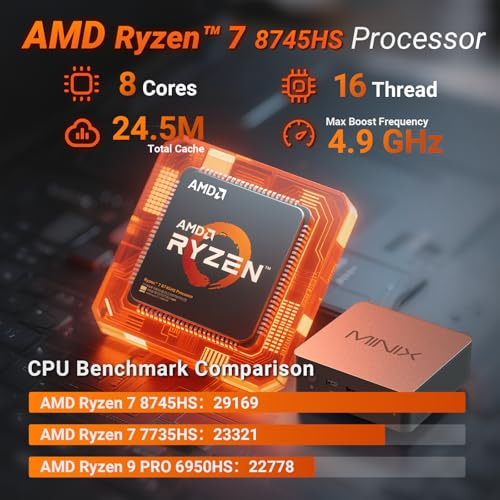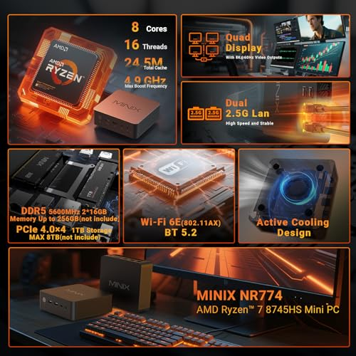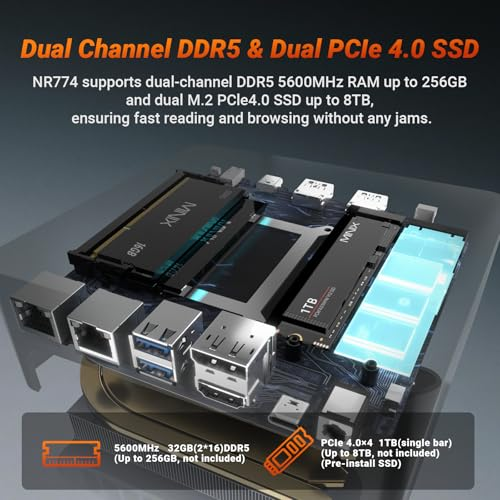 [Powerful Performance]Equipped with an AMD Ryzen 7 8745HS processor (8 cores/16 threads, up to 4.9GHz), the NR774 Ryzen 7 mini PC delivers robust multi-threaded processing. It effortlessly handles demanding applications, making it a capable gaming mini PC as well. You'll enjoy faster processing, shorter load times, and a significant boost in productivity and entertainment—and it ships ready to use with pre-installed Windows 11 Pro [Abundant Memory & Storage]Featuring 32GB of fast DDR5 memory (up to 256GB, not included) and a pre-installed 1TB PCIe SSD (up to 8TB, not included), this mini PC provides ample workspace. Opening apps and large files is faster and smoother, and heavy multitasking is a breeze. Store extensive files and games locally, and upgrade storage or memory later to keep your system future-proof and efficient