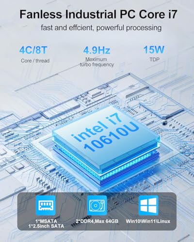 ăHigh-Speed ProcessorăThe JOVCOR industrial mini PC is equipped with a Core i7-10610U processor (4C/8T, up to 4.9GHz) and features advanced 14nm lithography, enabling efficient and smooth multitasking. Pre-installed with Windows 11 Pro, itâs ready to use right out of the box, while also being compatible with multiple operating systems. This mini pc meets the needs of diverse scenarios, including industrial equipment, multimedia teaching, and daily office work. ă4K Triple Displayă This mini desktop computer supports HDMI, EDP and Type-C display outputs, providing 4K resolution. It's suitable for a variety of scenarios, including office work, home entertainment, industrial equipment, network security, and digital surveilLance. It delivers stable performance during multitasking and improves work efficiency.