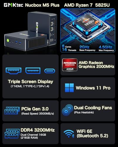 【Gaming Office Mini PC】UPGRADED GMKtec Nucbox M5 Plus Series is equipped with the powerful AMD Ryzen 7 5825U processor, 8 Cores/32 Threads, Boost up to 4.50GHz, Based on the ZEN 3+ architecture, preinstalled with Windows 11 pro, this small but powerful mini pc delivers satisfying results in productivity, office work, and gaming. 35% Performance increase over previous AMD Ryzen 5 5600U 5560U 5500U. 【32GB DDR4 RAM & 512GB PCIe SSD】Installed with DDR4 32GB RAM Dual Channel (2x8GB), the Nucbox M5 mini pc support expansion to 64GB RAM. Featured with 512GB M.2 2280 PCIe 3.0 SSD, support dual slot expansion to PCIe 4.0 4TB SSD. (Upgrades not included)