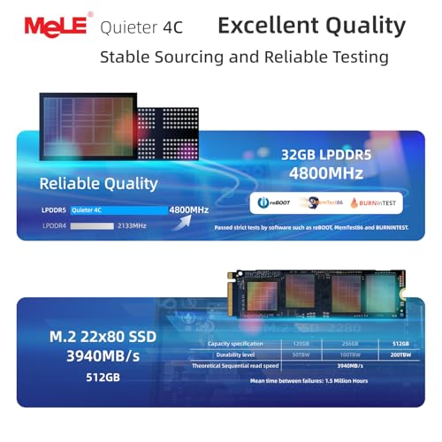 Next-Gen Performance -- MeLE Quieter 4C N150 adopted the latest Twin Lake N150 CPU 4 Core 4 Threads 6MB cache, burst speed up to 3.6GHz. Compared with the Alder Lake Series, the N150 offers an overall performance improvement of 6%-10%, and 15% improvement over the N95. Ideal for routine tasks, office work, home entertainment, industrial and astrophotography. High-Speed Performance and Expandable Storage -- Enjoy faster computing with 32GB of LPDDR5x RAM and 512GB storage. Ideal for home working, business offices, IoT, school education, and billboards. Expand storage effortlessly with a Micro SD card slot (up to 2TB) and an internal M.2 2280 SSD slot (up to 4TB, supporting both Nvme and SATA M.2 SSD).
