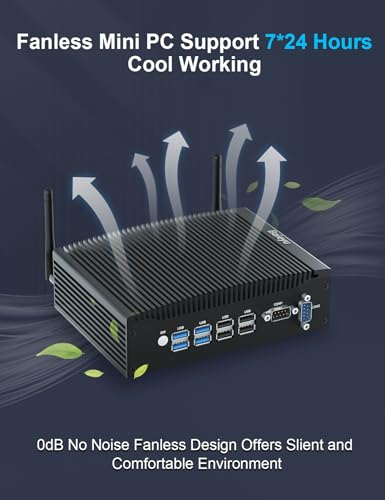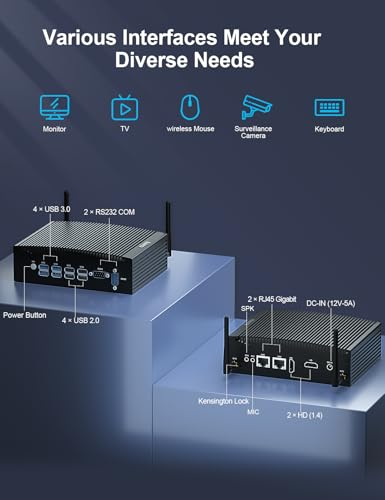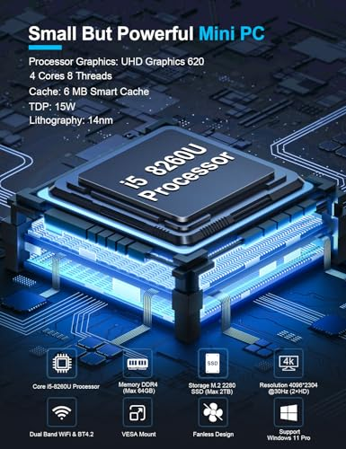 ❤️【Fanless Mini PC】This Fanless industrial mini computer is pre-installed with Windows 11 Pro (64-bit), built-in 8th Generation Core i5-8260U Processors, 6 M Cache, 4 Cores 8 Threads, Base Frequency 1.60 GHz Turbo Frequency 3.90 GHz, UHD Graphics 620, 12V low voltage. The compact size has powerful functions, and it can easily run office software such as Microsoft Office, One Drive, Outlook, etc., making your work easier. ❤️【I/O Specifications & Storage Port】The fanless mini PC i5 is designed with 2 × HD ports, 4 × USB 3.0 ports, 4 × USB 2.0 ports, 2 × RJ45 Gigabit LAN Ports, 2 × DB 9Pin RS232 COM Ports, 1 × DC port, 1 × Kensington Lock. 2 × DDR4 260pin SO-DIMM Slot, maximum support 64GB, 1 × M.2 2280 slot, support M.2 SATA or NVME (PCIE 3.0 X4) SSD (not included, need to be purchased separately), maximum capacity 2TB. 1 × SATA 3.0, used to expand 2.5-inch SSD/HDD (not included), the maximum supported capacity is 2TB.
