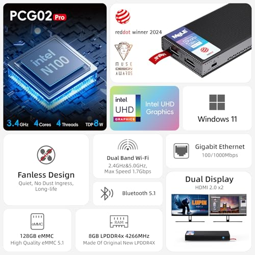 MeLE PCG02 Pro Mini PC Stick Fanless with Windows 11 Pro, N100 8GB RAM 128GB Storage, Mini Computer Dual HDMI, LPDDR4 4266MHz, USB Type-C PD3.0 for Office, IoT, Multimedia, Home